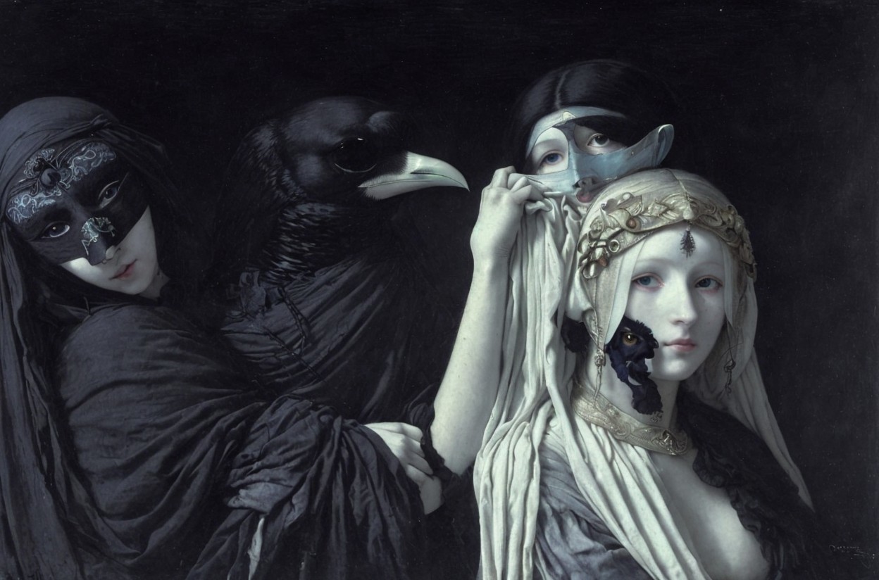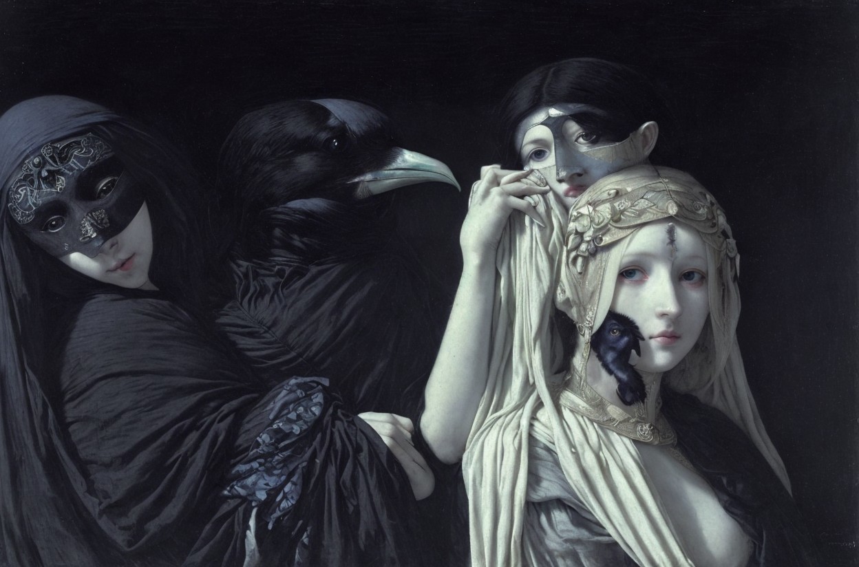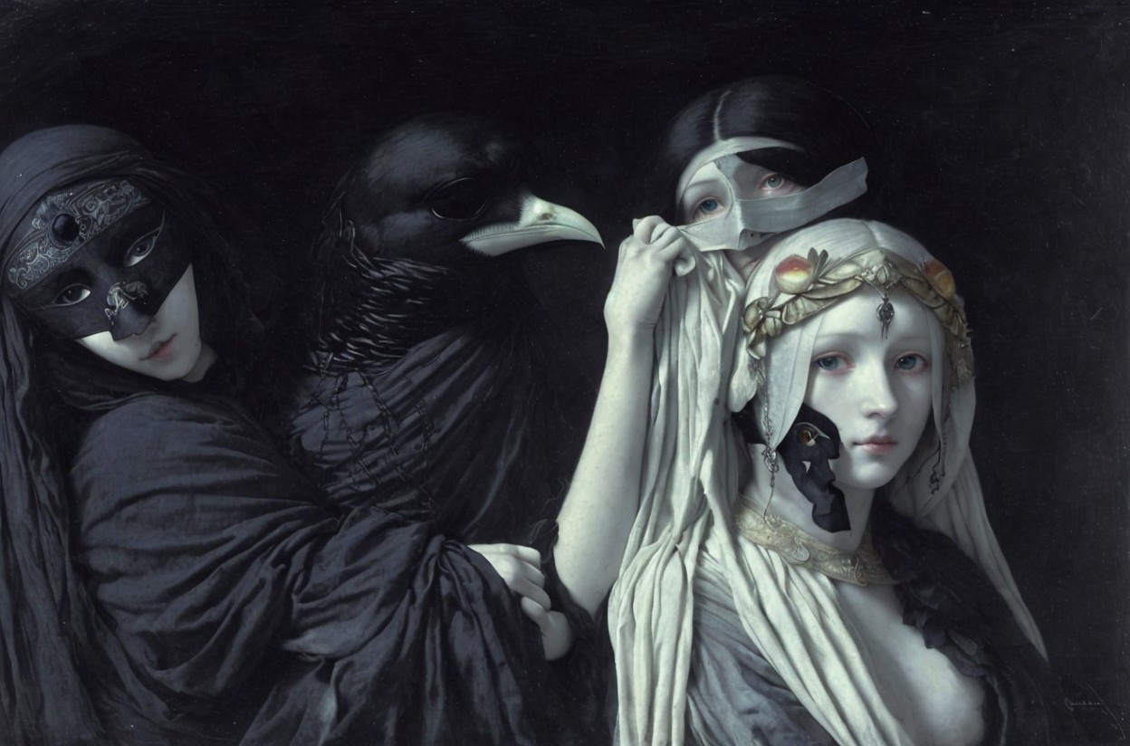 The artwork features three ethereal figures: one wears a black mask, another holds a raven, and the third, adorned with a floral crown, gazes mysteriously, all against a dark backdrop.