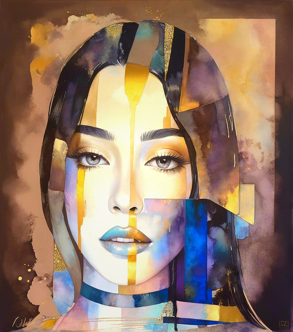 Prompt: Vibrant patchwork creation, abstract artistry, retrofuturistic essence, radiant and foreboding aesthetic, wet-on-wet watercolor technique, estranged metallic paints, luminous effect, loose lineage, pastel color palette with sepia tones, mystery-evoking retro-inspired style, full fantasy setting. Ethereal young woman with tessellated black hair, pale gold and silky beige backdrop, dappled lighting from top, back-lit with diffused light, warm color scheme, whimsical background with bokeh effects and adherence to the Golden ratio. Ethereal atmosphere with a hint of grunginess, flares, flecks, abstract splashes, artist inspirations from ho baron, Vivienne Westwood, William Bradley, and Albert Bierstadt. Incorporate 3D effects, ambient occlusion for depth, high coloring, visual impact, stylized headshot. Parallax occlusion 1.2, xeroxed with Ilford Sprite 35-ii Reusable camera, push processing technique, dreamscape, traumacore 1.9, layered, dof, foampunk 1.5, Storybook illustration merged with art installation, overall composition by Didier Lourenço.