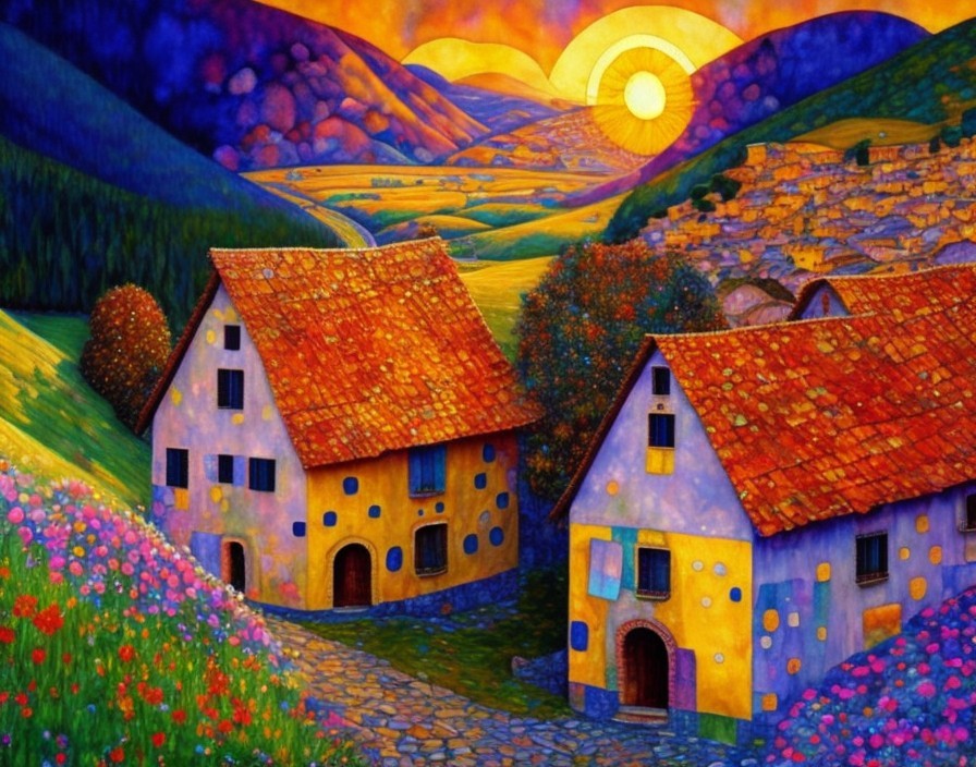 Colorful rural landscape painting with houses, hills, path, and sunset.