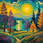 A vibrant landscape features a glowing sunset over a serene lake, with colorful trees and two cozy houses. The scene blends vivid hues of purple, orange, and green, evoking a dreamlike atmosphere.