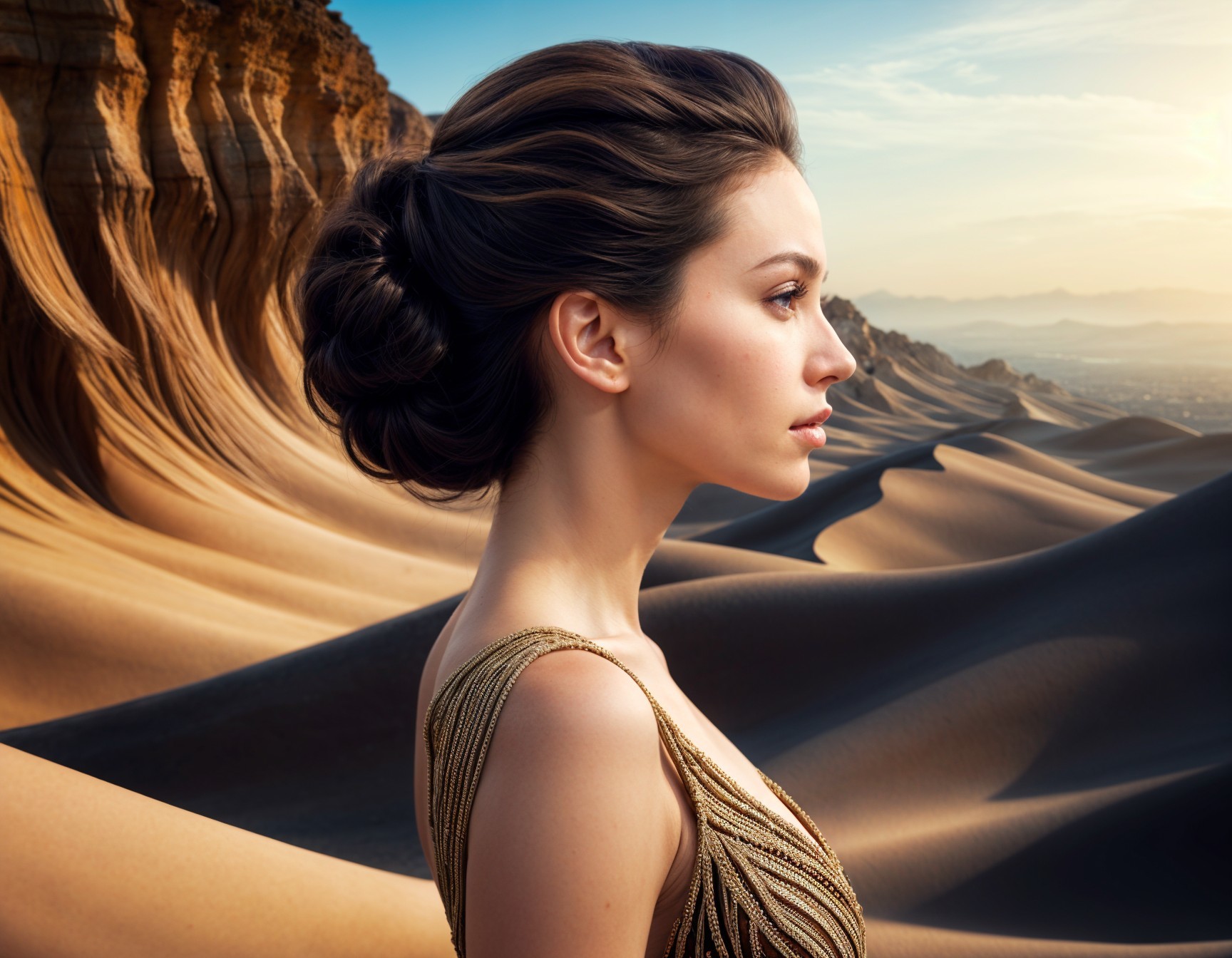 A serene profile of a woman with elegantly styled hair, set against a vast desert landscape at sunset. The warm colors highlight her features, creating a captivating and peaceful atmosphere.