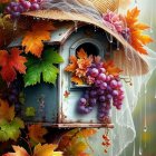 A charming blue birdhouse adorned with colorful flowers and a straw hat sits among vibrant autumn leaves, complemented by a cluster of grapes resting below it.