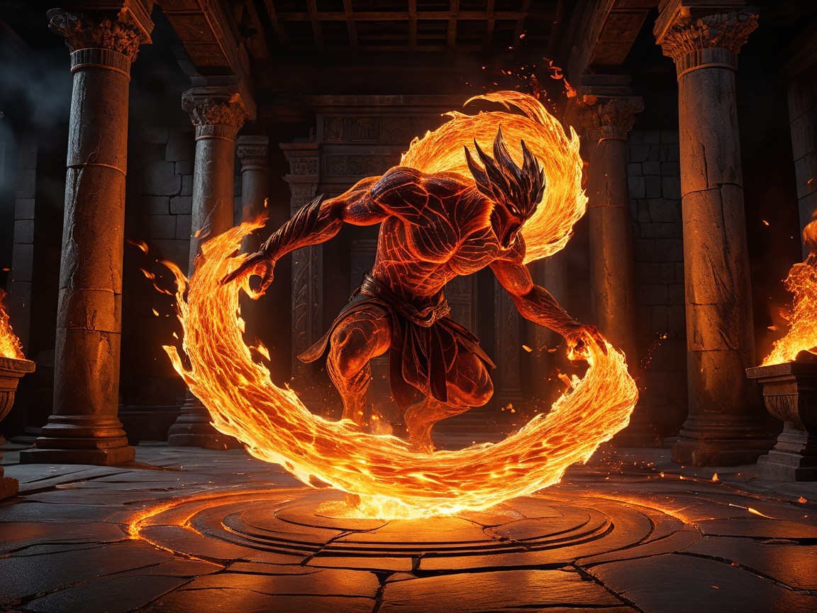 A towering figure made of molten lava stands amidst a fiery landscape, swirling magma around it. A large, glowing sun looms in the background, casting an intense, heat-filled ambiance.