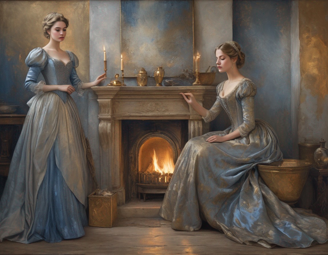 Prompt: Muted colour portrait in a layered mixed technique with elements of deep scratches and scuffs, evoking a sense of drama. Sitting by a warm, golden hearth, Cinderella's whole body is set aglow, soft flames dancing across her serene face, casting deep, mysterious shadows that accentuate her delicate features, her shimmering blue and silver gown a tapestry of intricate folds, catching the light, glass slippers sparkling like diamonds, radiant colours and light reflections from the fireplace dancing across the ornate stone walls, in the style of the dramatic, intensely romantic Caravaggio, with the captivating warmth of Guido Reni's majestic light and the mysterious allure of Georges de La Tour's captivating drama, loose, expressive brushstrokes, vivid, fiery oranges, blazing yellows, deep blues, roaring flames., dark background, colour palette of black and gold paint strokes, The art style is by Jeremy Mann and Fabian Perez. The painting also features elements of ink painting with muted colours, and a rice paper texture.