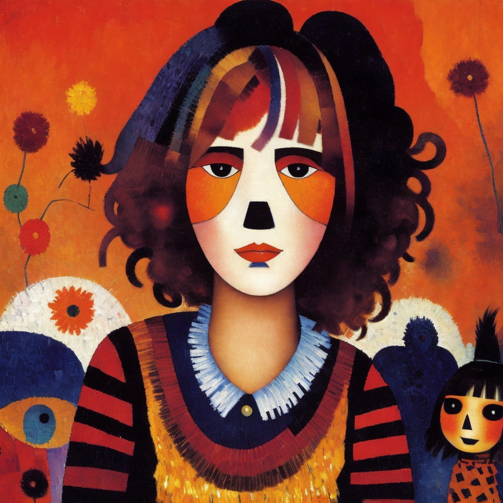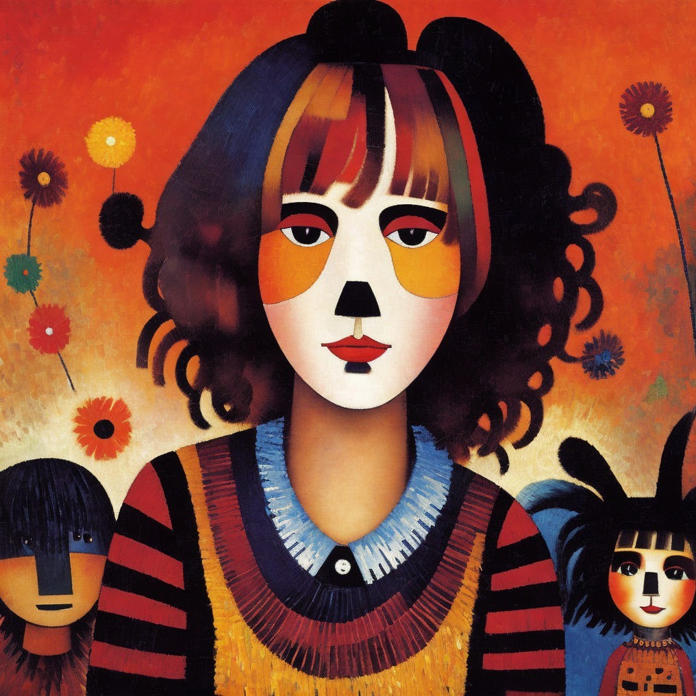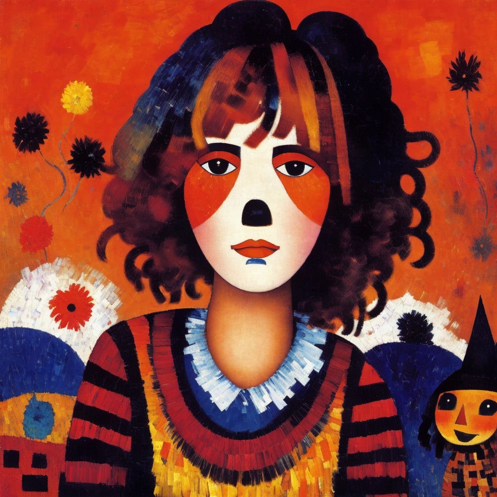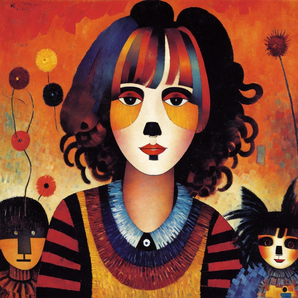Artistic Statement: This piece combines elements of Cubism, Surrealism, and Modernism, drawing inspiration from Paul Klee’s abstraction and vibrant color palette, Modigliani’s stylized portraiture, and the subtle surrealism reminiscent of Zdzisław Beksiński. The disheveled woman, strange dog, and scarecrow-like figure blend together in a dreamlike narrative, with geometric forms and color blocks reminiscent of Fauvism. The overall composition explores a juxtaposition of vivid colors and surreal imagery, evoking a sense of mystery and tranquility.