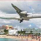 A large airplane descends toward a beach near colorful buildings. Sunbathers relax on the sand, while umbrellas line the shore under a partly cloudy sky.