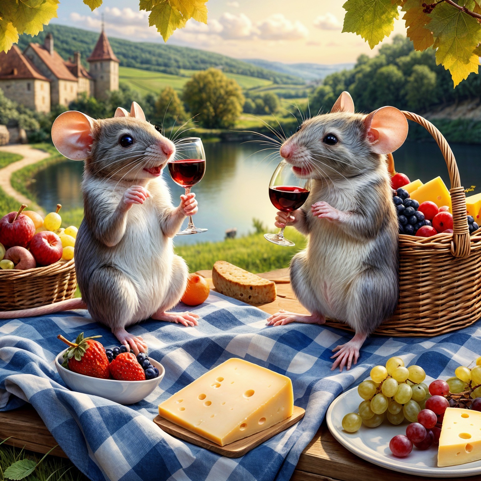 A charming scene with two cheerful mice drinking glasses of red wine, surrounded by baskets of cheese, fruit, and scenic French countryside views.