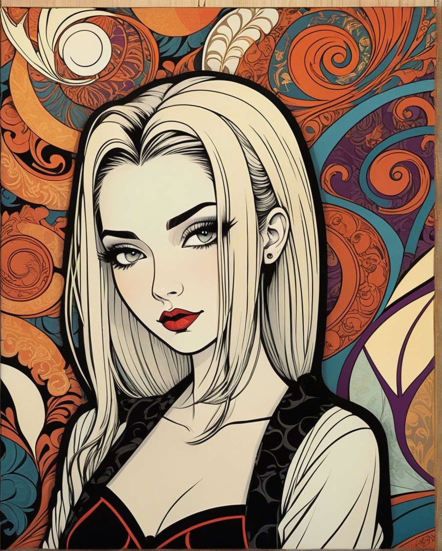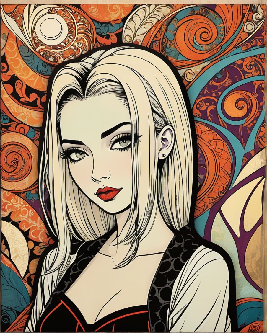 Prompt: istylized llustration, portraiture, female diva, upper body portrait emerging from whimsical patterns, dynamic lighting for a serene yet gothical ambiance, detailed textures with acetate and fabric patterns, enhancing the plasticity of the piece. Stylized woodblock print, stylized comic book art character in stacked-up perspective, lineage with thick stroke, hyper-detailed textures, graphically diverse textures, rounded edges, juvenile gothic rock outfit, satin blouse with frilly-like details, contouring outlines by stan lee, eroticism, seductive, sexy,, watercolor and ink style by ho baron, art nouveau style, soft pastel coloring, seductive, dethereal, details in watercolor wash, watercolour style, Water colour and pen, dim concrete background, waves,misty, retrofuturistic, serene, quaint, joyful, foampunk, uhd,hdr, octane render illustration 1.5, comic book art 1.7, grunge, coherent, stacked-up perspective, charcoal textures 1.7, fantasy style heroine in style of Overton Loyd and Susan Seddon Boulet, dark fantasy, kinetic flares and dripping details, uplifting, plasticity 1.6, luminosity 1.3, spray paint details,The background has a stylized filigree style, brushstroke fields, reminiscent of watercolor & ink, stippled, luminosity 1.9., stippled, abstract cubistic features reminiscent of american gothic 1.7, triadic color scheme red black beige, hues, close-up, Handsome hairdo, rounded edges, quilling, delicate coloring 1.8, blurry edges, rim dynamic lighting, stylized, stippled, (woodblock print (triadic color scheme beige, black, grey) 8:11), perfect handsface, squiggly line-art features, vivid illumination, intricate hairstyle), tints of comic book art, 7:11), luminous plasticity, auracore, 3d effects, octane render, eroticism, smooth edges, smooth, colored spaces, interplay of light and dark, otherworldly, rim lighting from bottom, sculpted, baroque, art nouveau details, cubistic fractalization, merged styles of Georgia O'Keeffe and Overton Loyd ,
