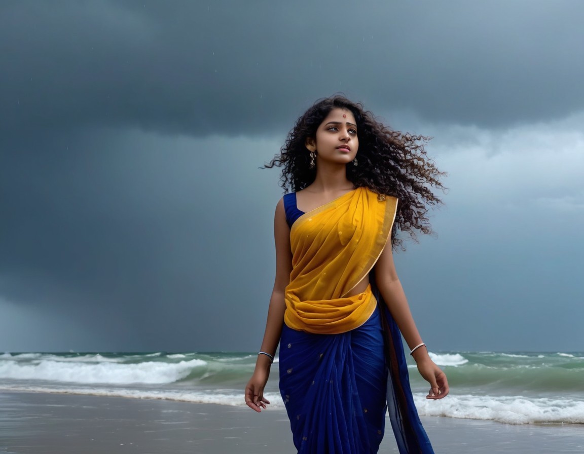A woman in traditional Indian attire stands on a beach under stormy skies, with wind in her hair.
