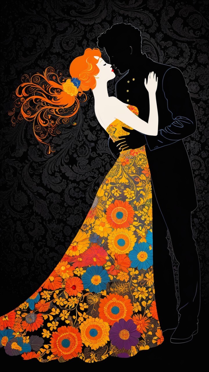 A striking illustration of a couple in an intimate embrace. The woman wears a vibrant, floral-patterned gown with orange and colorful flowers, while the man is silhouetted against a dark background.