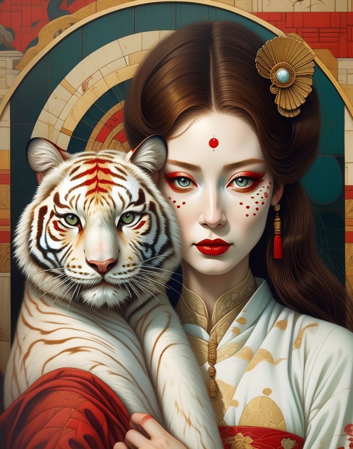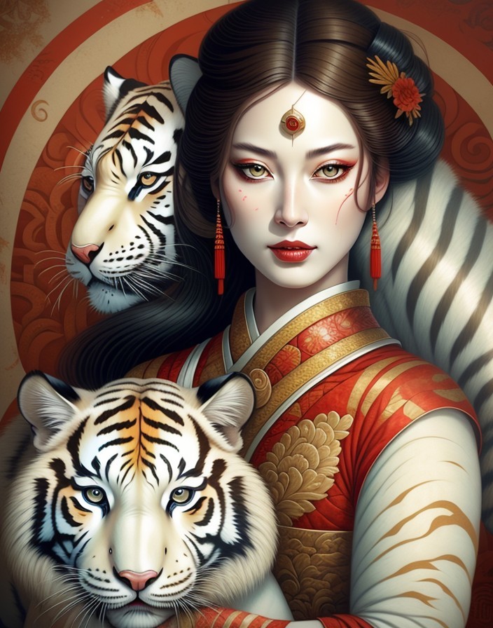 An illustrated portrait of a woman in traditional Japanese styling with intricate hair, makeup, and kimono against an autumn leaf backdrop.