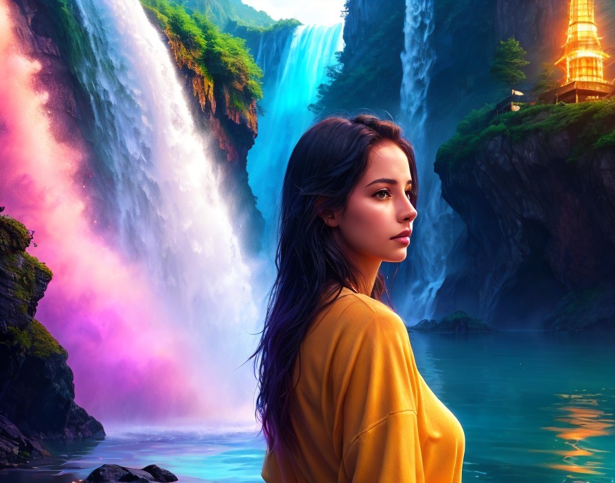 Dark-haired woman in yellow top near turquoise lake with dual waterfalls