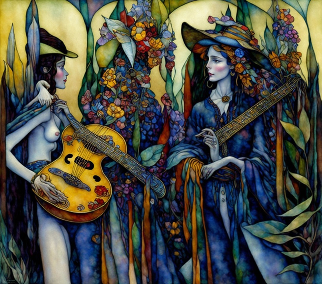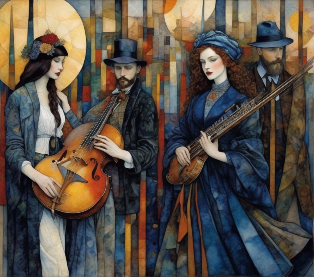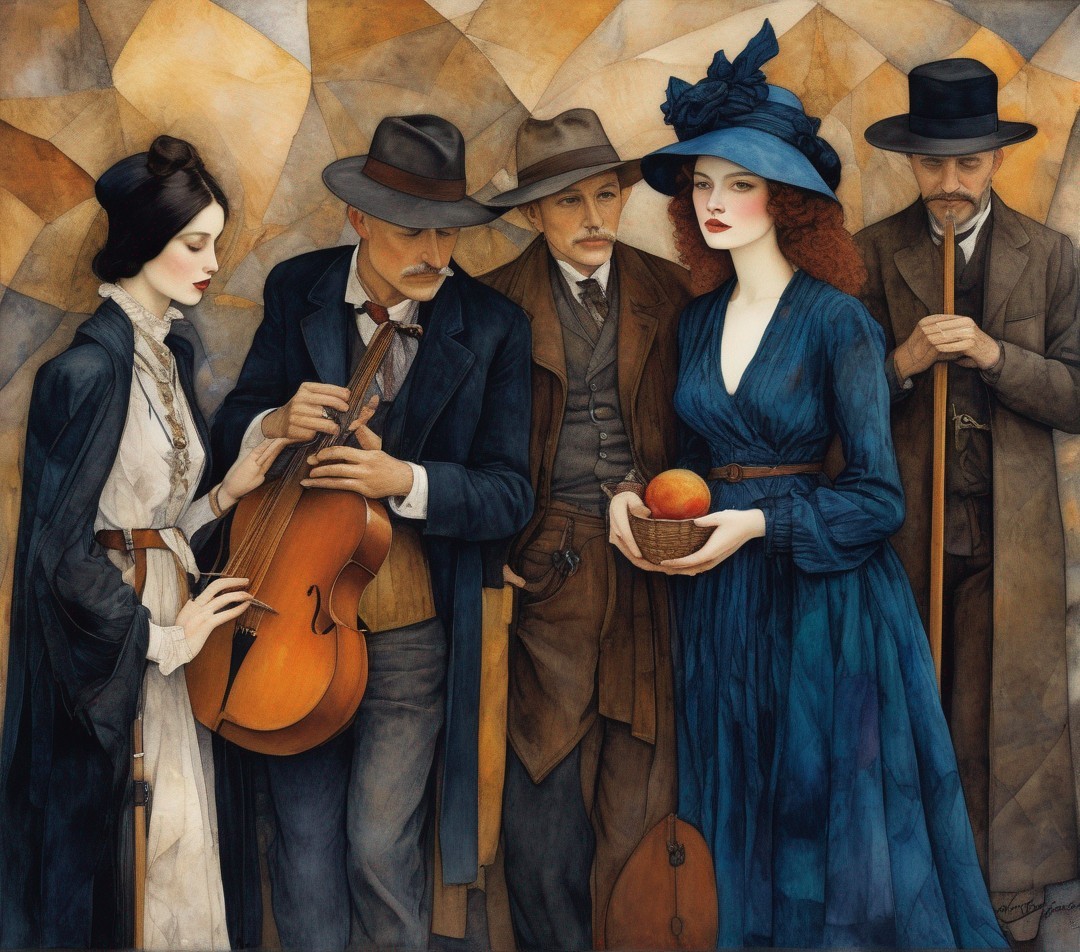 An elegant woman in vintage attire sits by a tranquil canal with bridges and old buildings in a serene, sunlit scene.