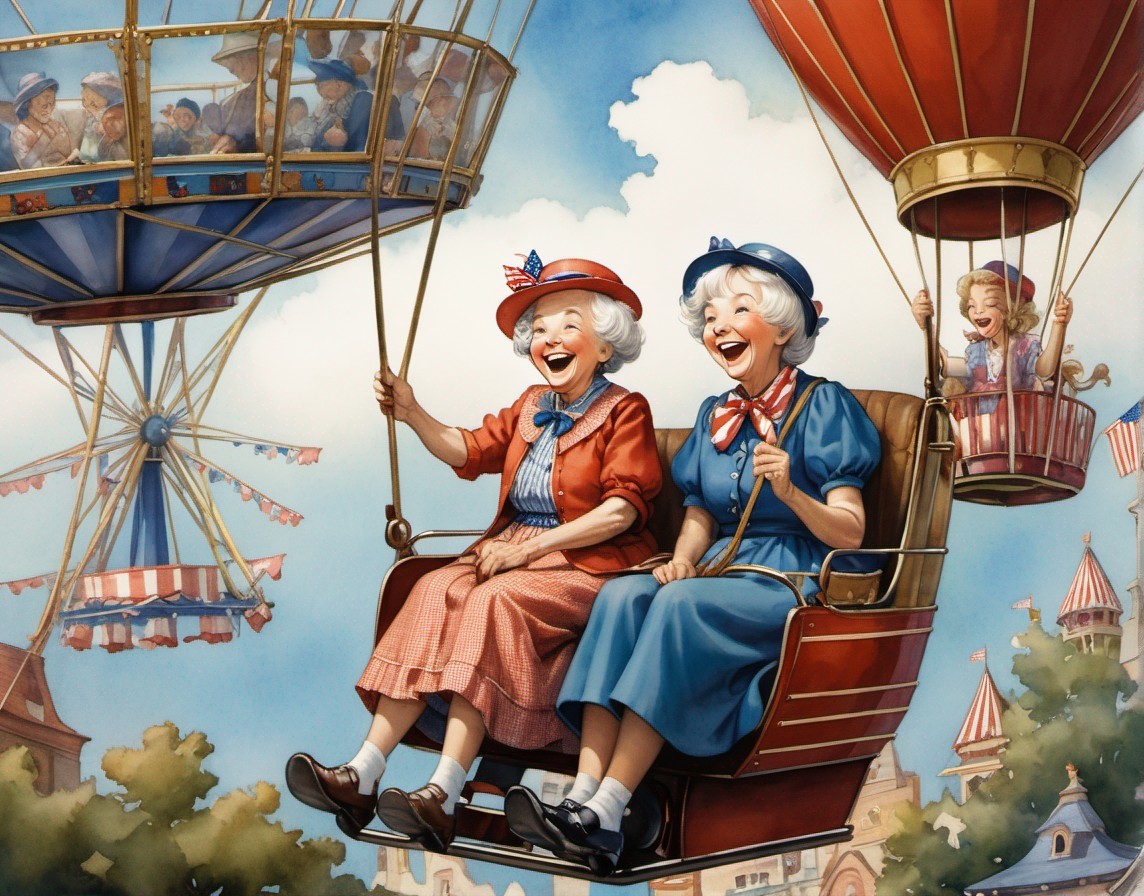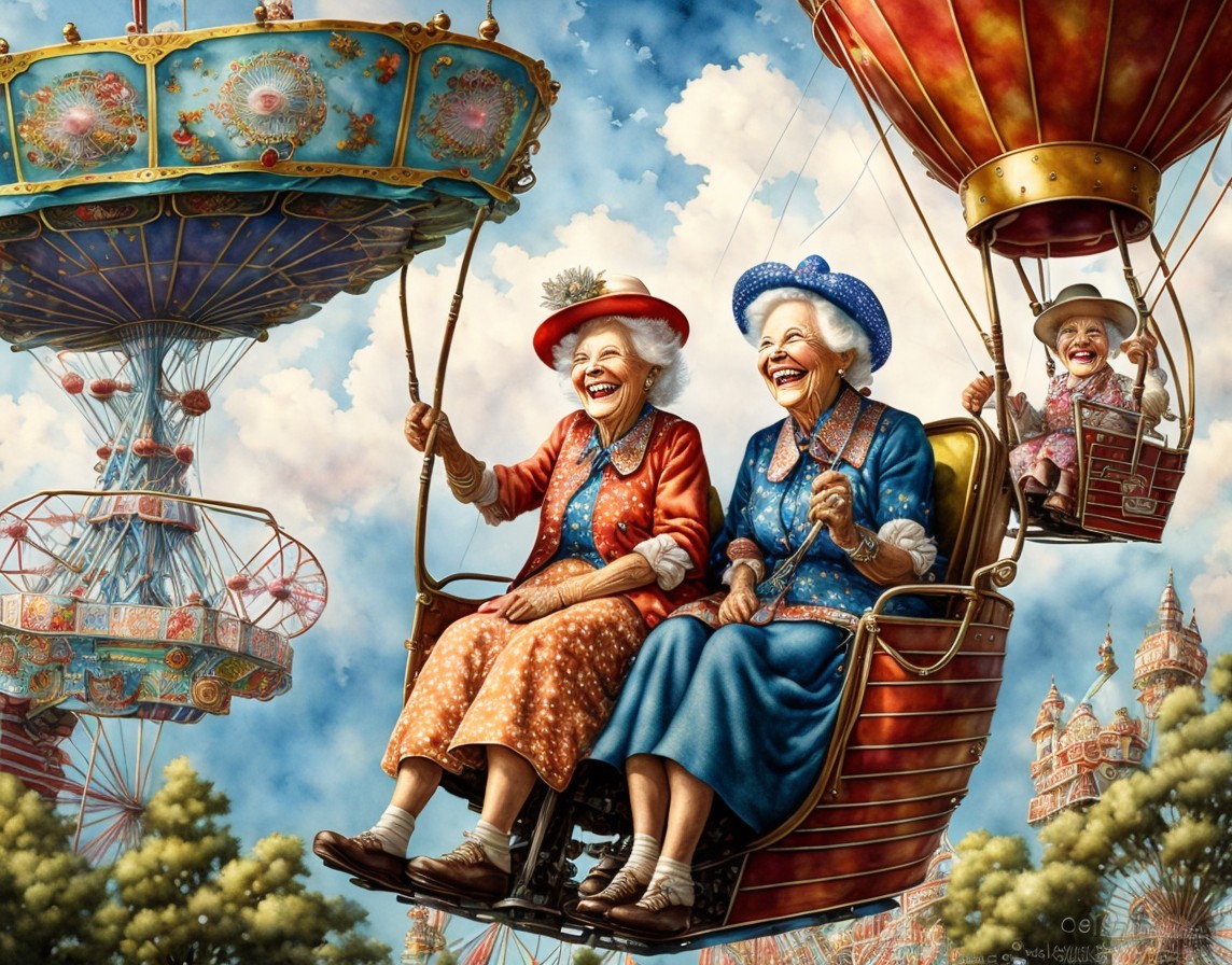 Two elderly women joyfully ride a swing ride at a fair, laughing under a sunny sky with a Ferris wheel in the background.