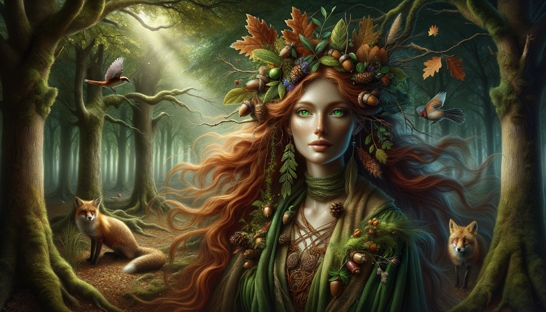 Prompt: Amidst the ancient woods, under the canopy of whispering leaves, stands the Forest Guardian, a figure of legend and nature's steward. In the style of Alphonse Mucha, the guardian is depicted with a serene expression, embodying the tranquil spirit of the forest. Her hair is a vibrant shade of autumn leaves, flowing freely and adorned with acorns and sprigs of greenery, symbolizing her deep connection to the woodland realm. Her attire is woven from the very essence of the forest, with textures resembling bark and moss, complemented by delicate floral patterns. The guardian's eyes, a clear emerald green, are windows to the soul of the forest, reflecting its purity and ageless wisdom. She is surrounded by a menagerie of woodland creatures, each rendered in hyper-realistic detail, from the soft fur of the foxes to the iridescent feathers of the birds. The lighting is a dappled mixture of sunlight and shadow, creating a dance of light that plays across her figure and the forest floor. The color palette is rich with the hues of the forest: deep greens, earthy browns, and the occasional splash of wildflower colors. This oil on canvas portrayal should be in ultra-high resolution, capturing the intricate details of her harmonious existence within the natural world.