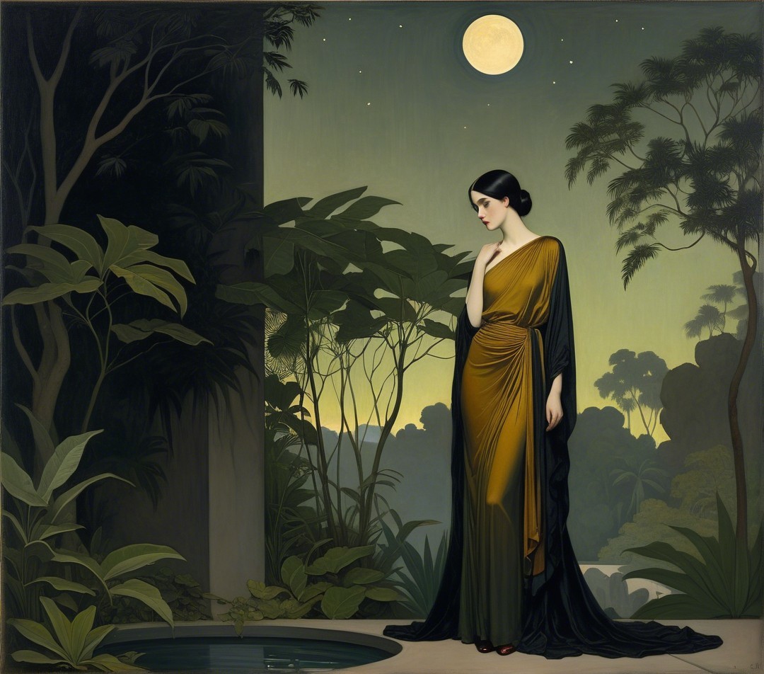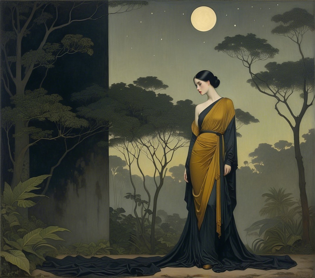 A woman stands gracefully in a lush jungle at night, illuminated by a full moon. She wears a gold dress with a flowing black cape, surrounded by vibrant greenery and soft shadows.