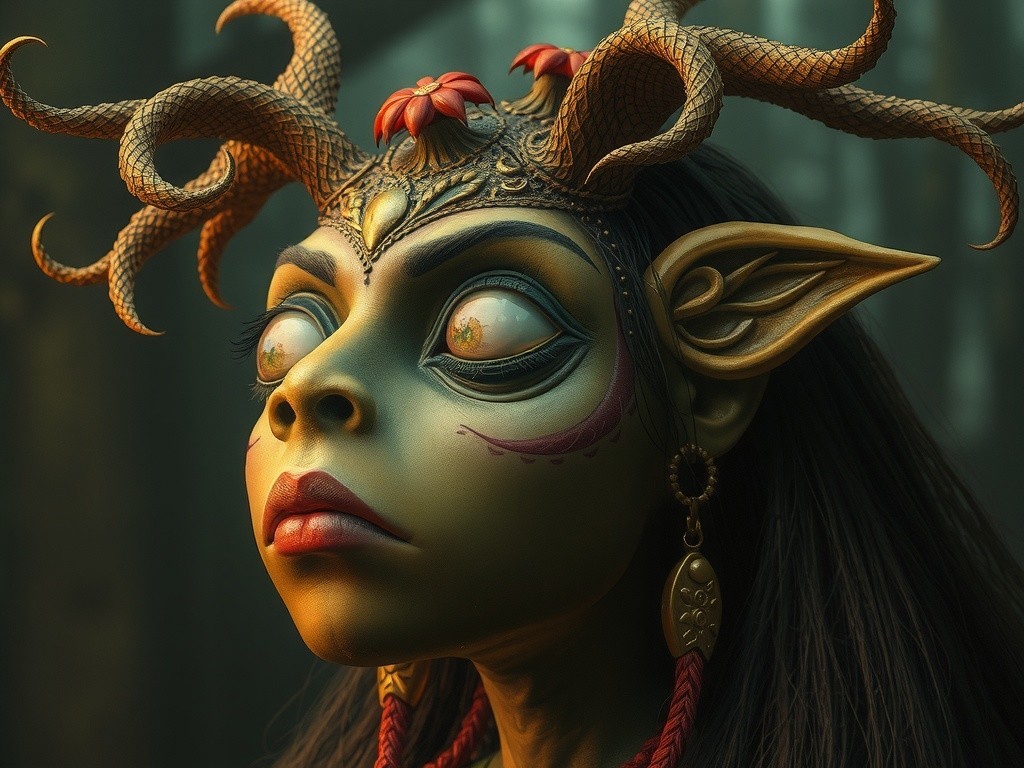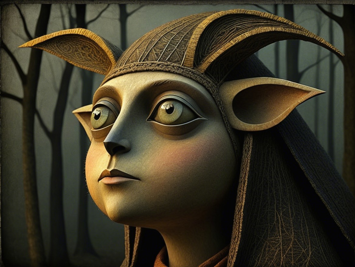 Prompt: "Beautiful druid Creature in the style of Edward Gorey, Maurice Sendak Art Brut, moody, somber, desaturated colors, in the style of Paul Klee, Arthur Rackham