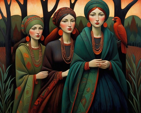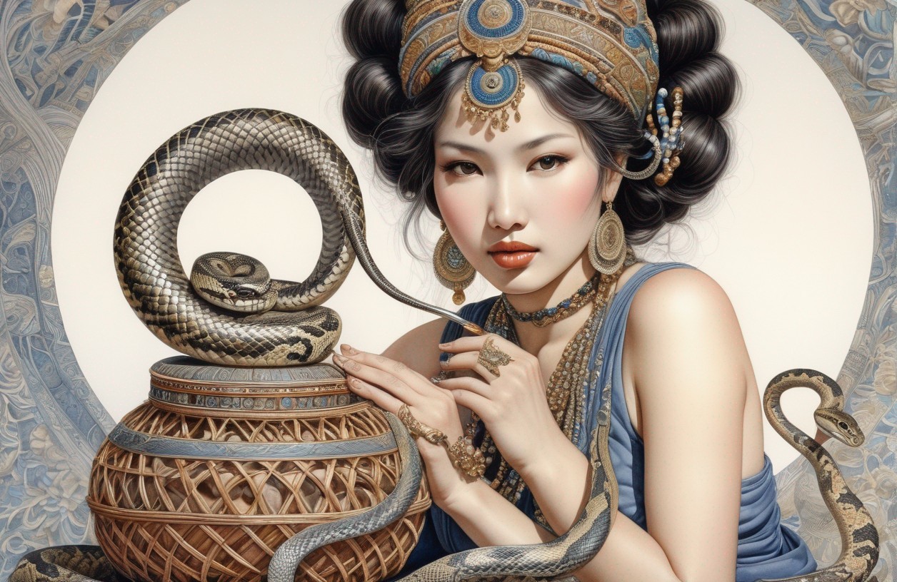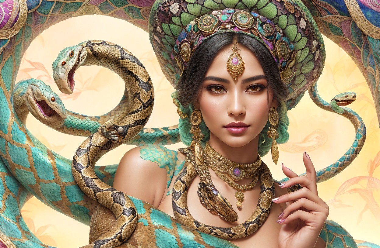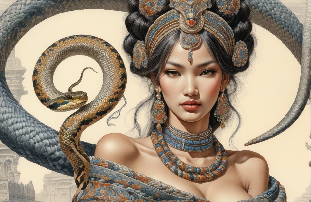 A regal woman in ornate attire with a snake coiled on her arm, against an ornamental blue backdrop.