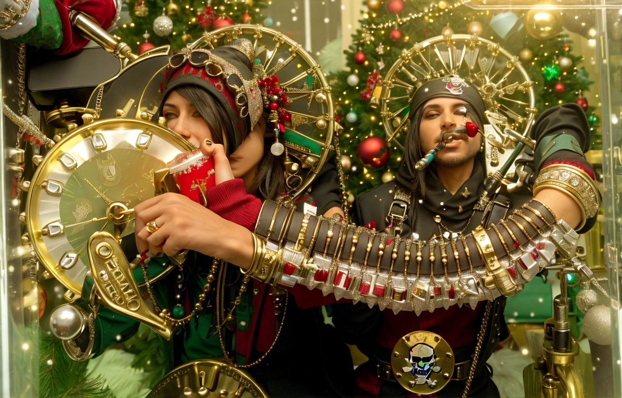 Pair in Pirate and Clock Costumes by Christmas Tree