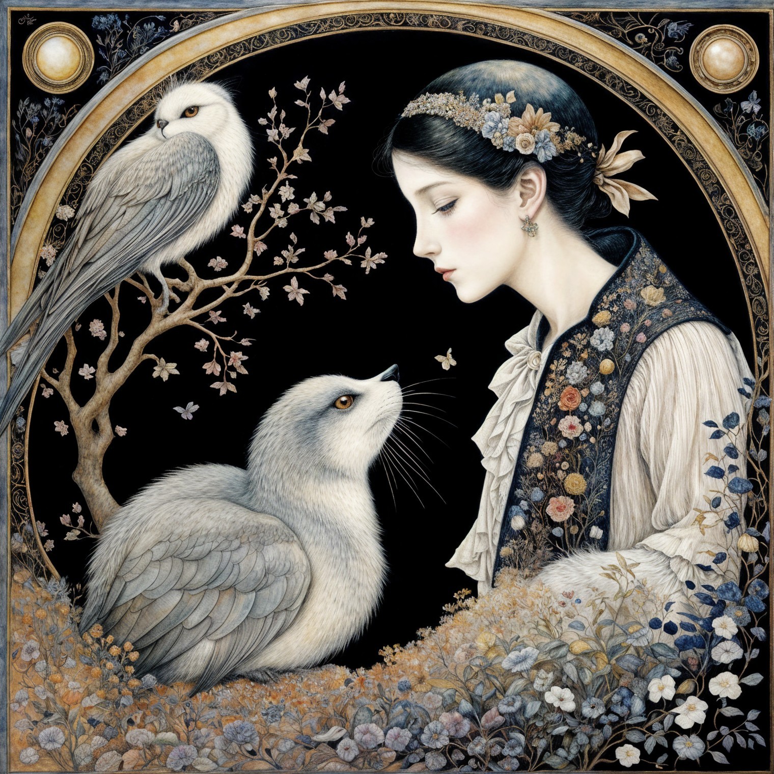 A serene young woman gazes lovingly at a dog under a starry night sky, framed by a crescent moon and a stylized tree, capturing a moment of quiet companionship and magic.