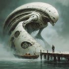 A surreal and futuristic scene featuring a massive, biomechanical creature rising from the misty waters. The creature has an elongated, sleek form, reminiscent of an abstract aquatic life, with intricate mechanical details. A lone figure stands on a weathered wooden pier, gazing up at the imposing being, creating a sense of awe and scale. In the background, a small, old boat floats gently on the water, adding to the atmosphere of mystery and intrigue. The overall color palette is muted, with shades of gray and hints of green, enveloped in a foggy ambiance.