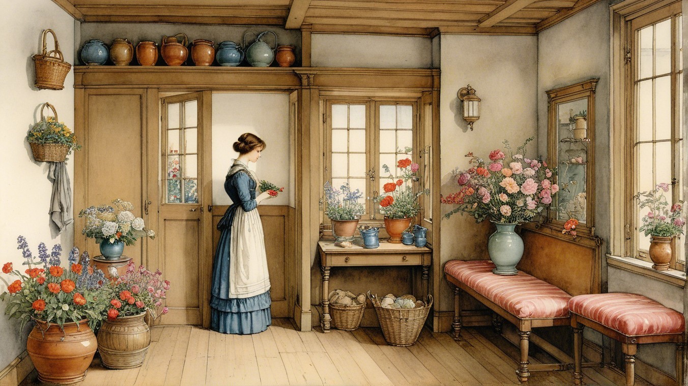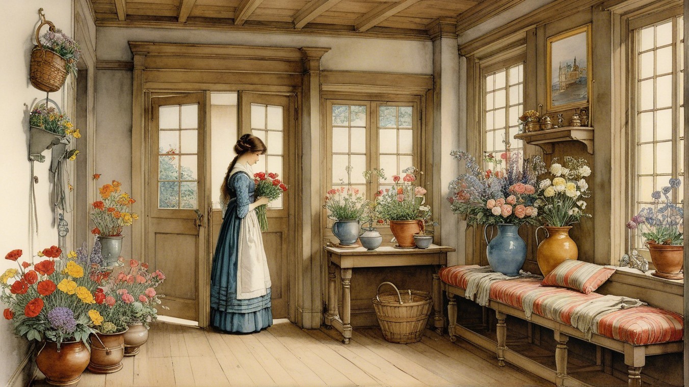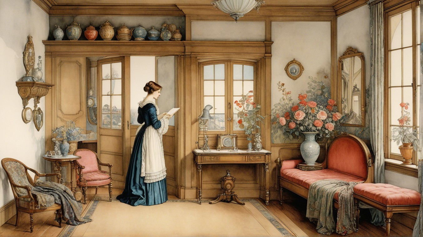A luxurious vintage bedroom features a four-poster bed, elegant furniture, and intricate wallpaper depicting a garden. A woman in a gown admires the decor, adding to the room's grandeur.