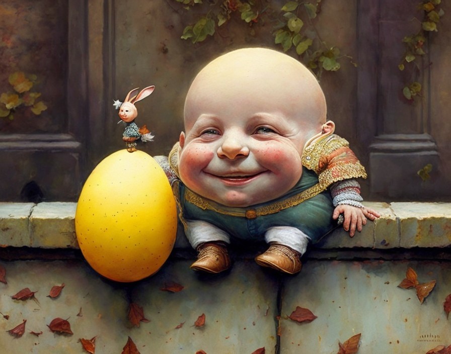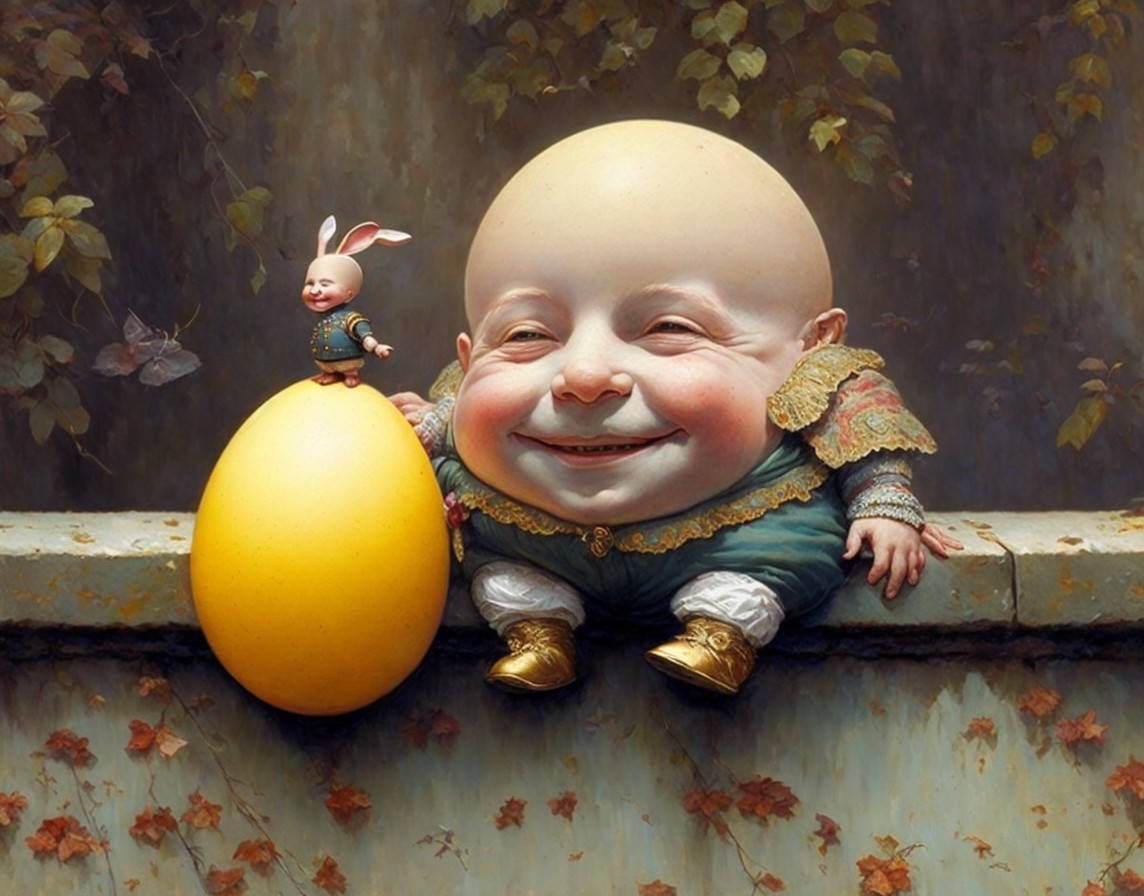 A whimsical painting of a chubby, smiling baby-like creature beside a golden egg with a tiny rabbit on top, set against a floral backdrop.