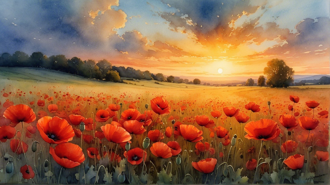 A vibrant watercolor scene of a sun setting over a golden field, dotted with bright red poppies. The sky is filled with soft clouds and warm hues, creating a serene and picturesque landscape.