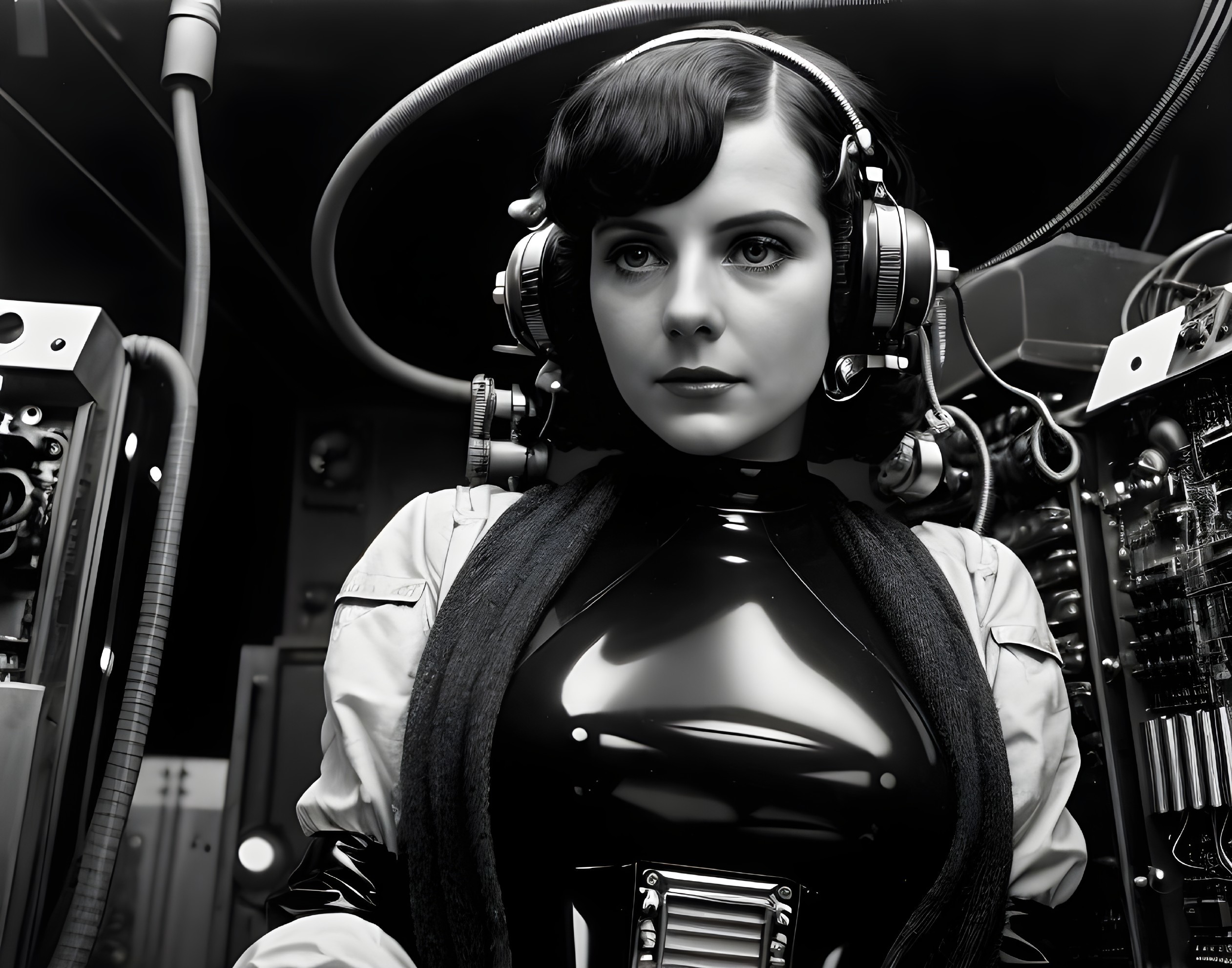 A monochrome image of a woman with futuristic attire and headphones in front of electronic equipment.