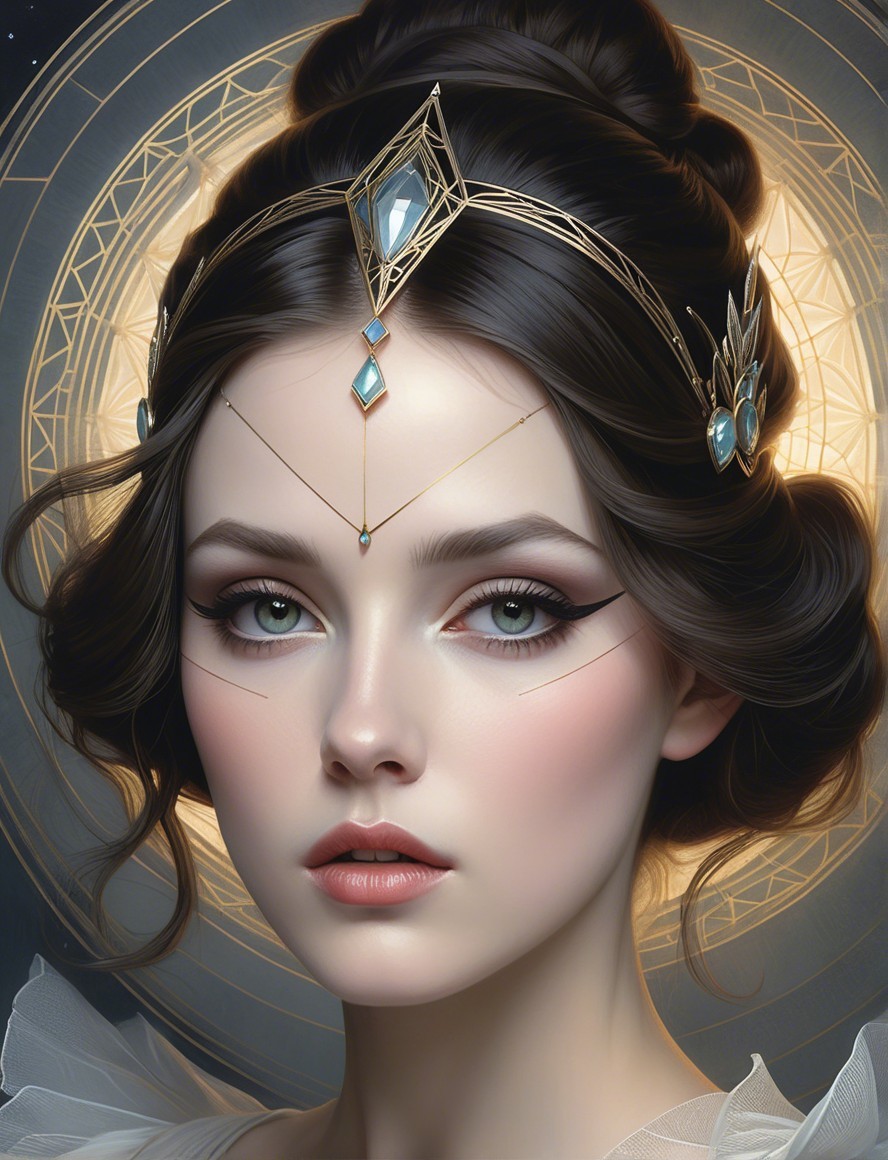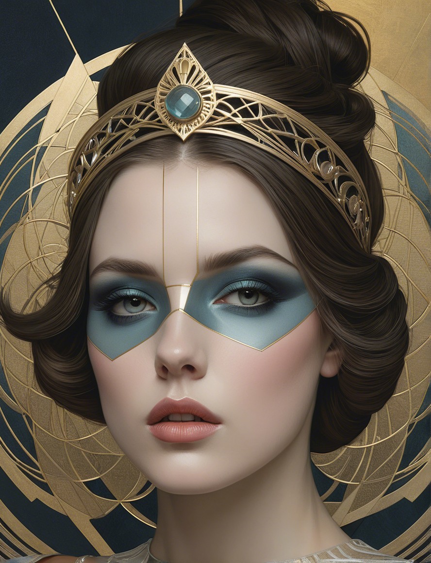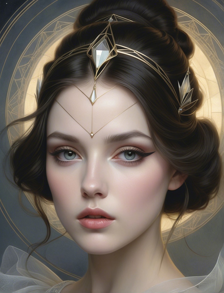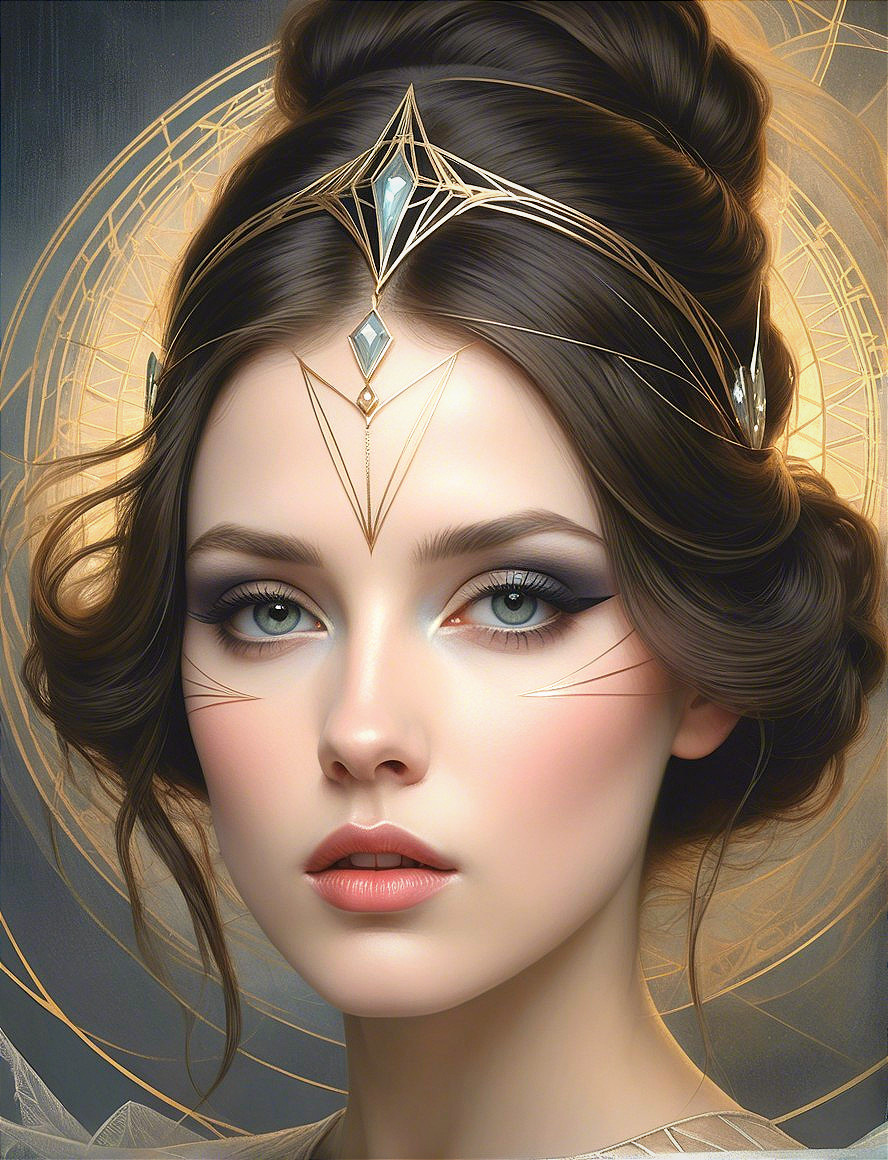 A serene young woman with elegant features and striking makeup gazes intently. She's adorned with a delicate gold crown, set against an intricate, softly illuminated background.