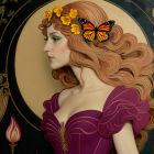 A graceful woman with flowing red hair adorned with a butterfly and flowers, set against an intricate background featuring floral motifs. She wears a deep burgundy dress and exudes elegance.