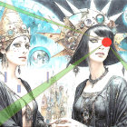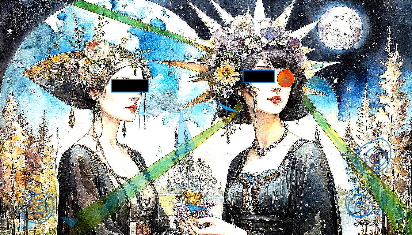 The image features two elegantly dressed women with obscured faces, surrounded by a celestial backdrop of stars and a moon. They radiate an ethereal beauty amidst nature's serene landscape.