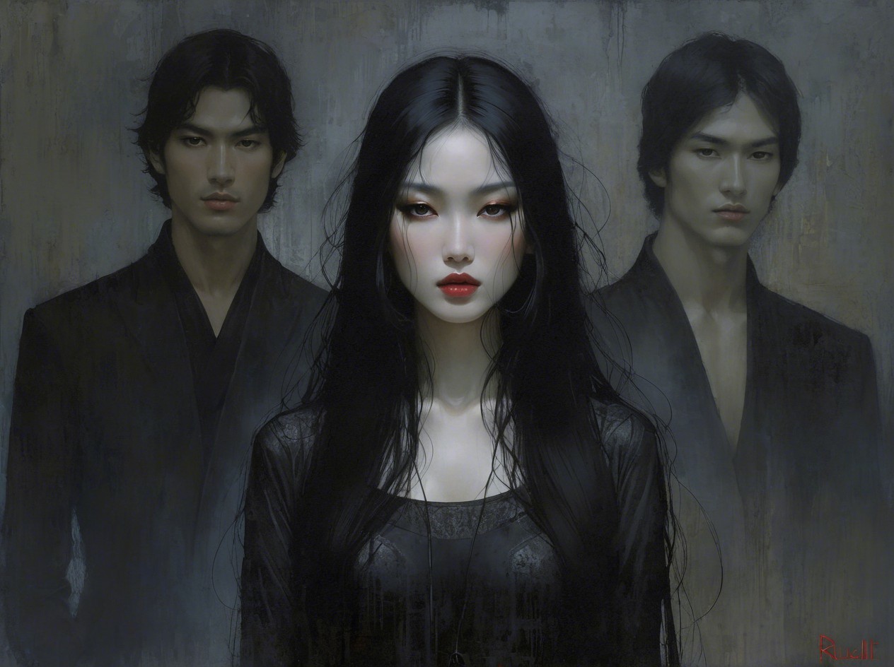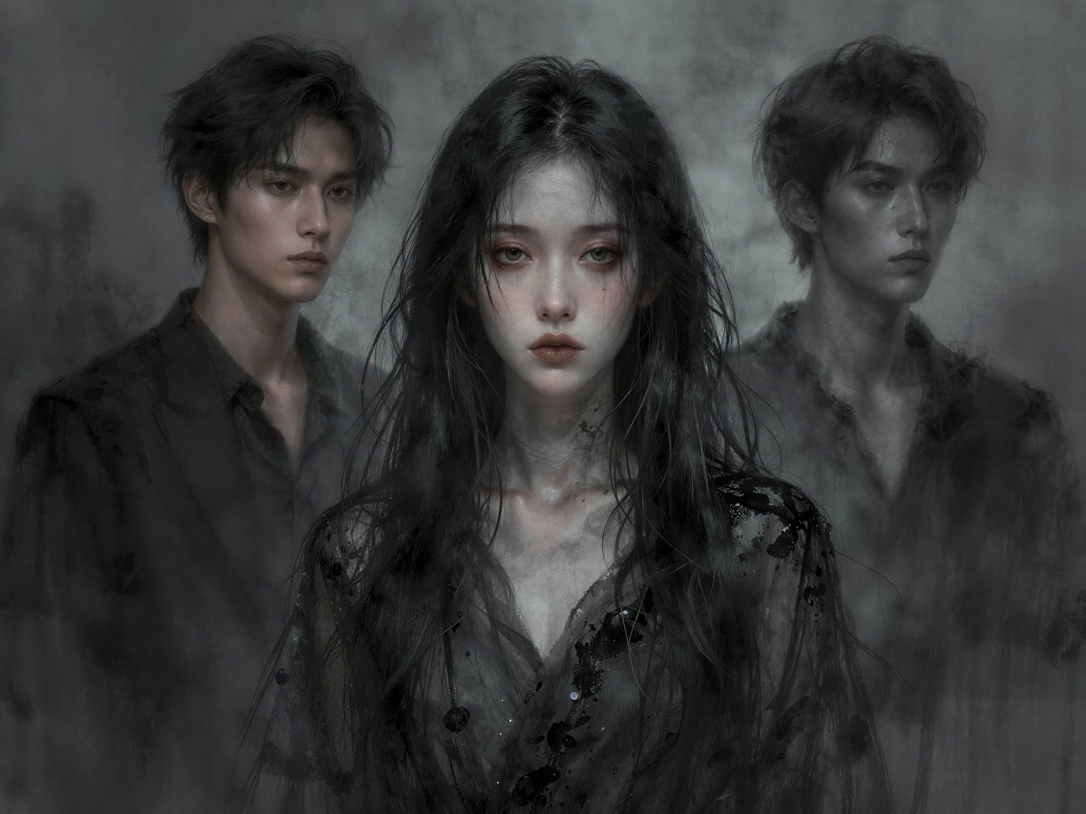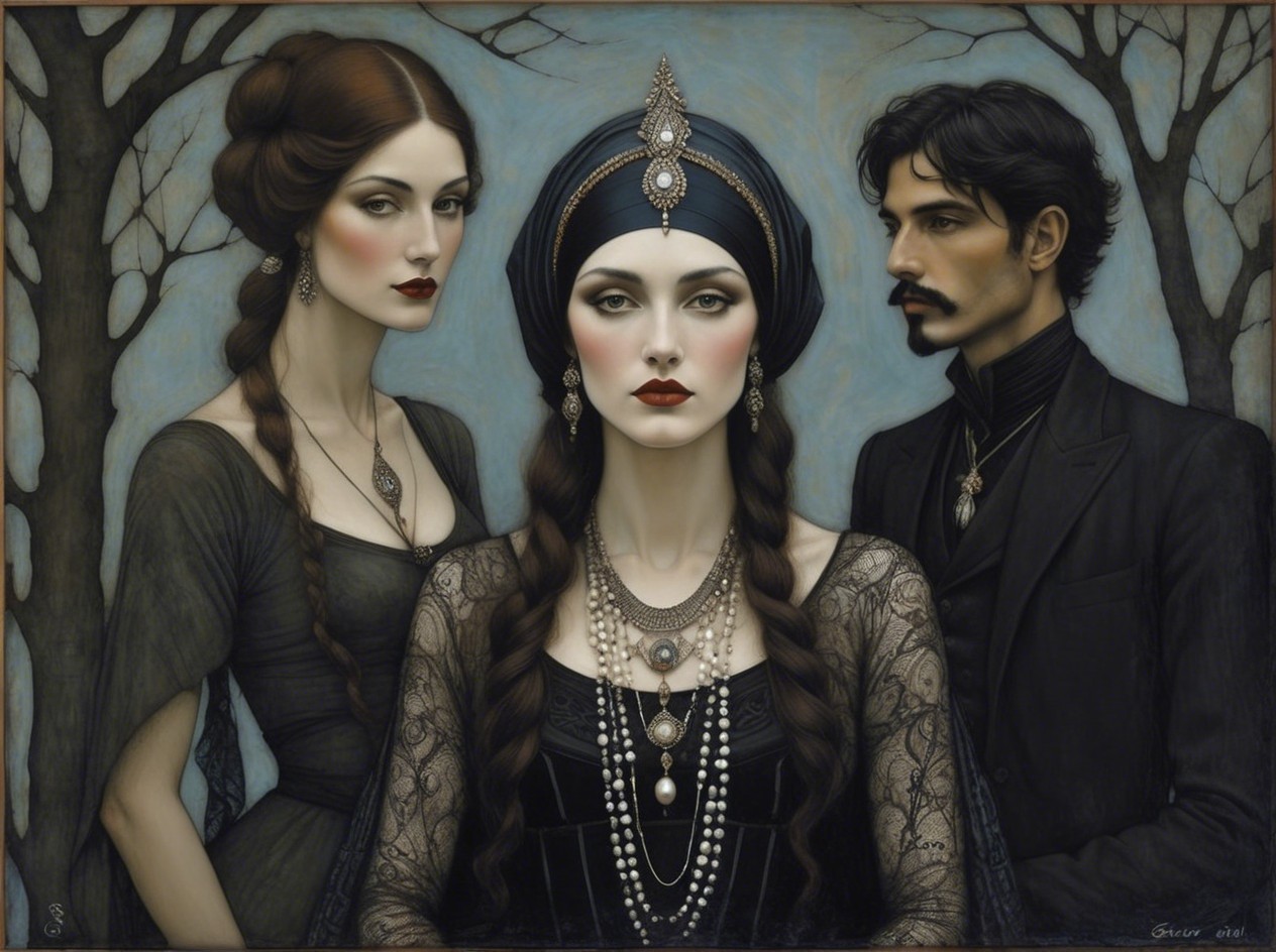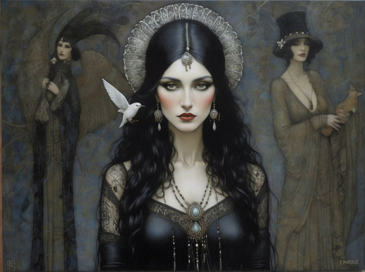 A highly detailed digital painting of a Goth witch queen with pale skin, long flowing black hair, dark eyeshadow, and red lips, wearing a black dress with intricate silver and gold patterns, adorned with pearl and gemstone necklaces and earrings, and a large ornamented crown with a central jewel, against a dark