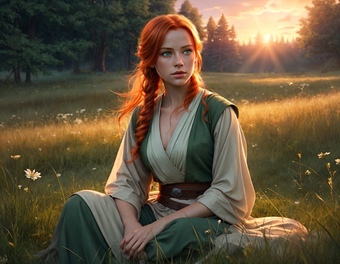 Red-haired woman in green medieval dress sitting in grassy field at sunset