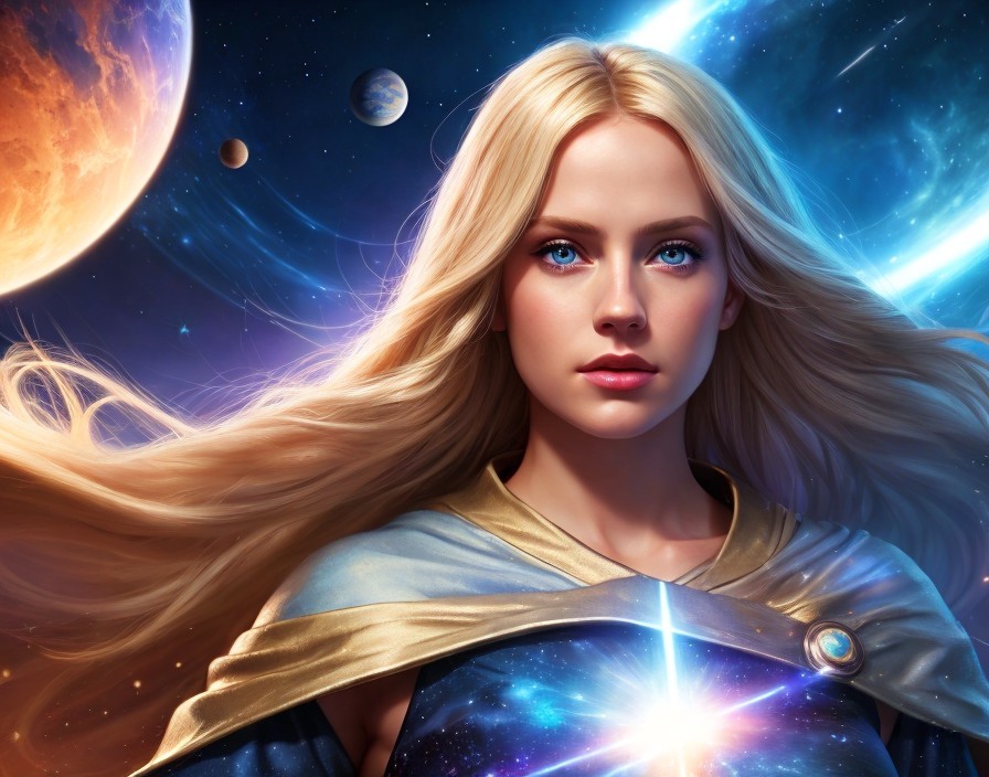 Blonde woman digital portrait with cosmic theme and spaceship.