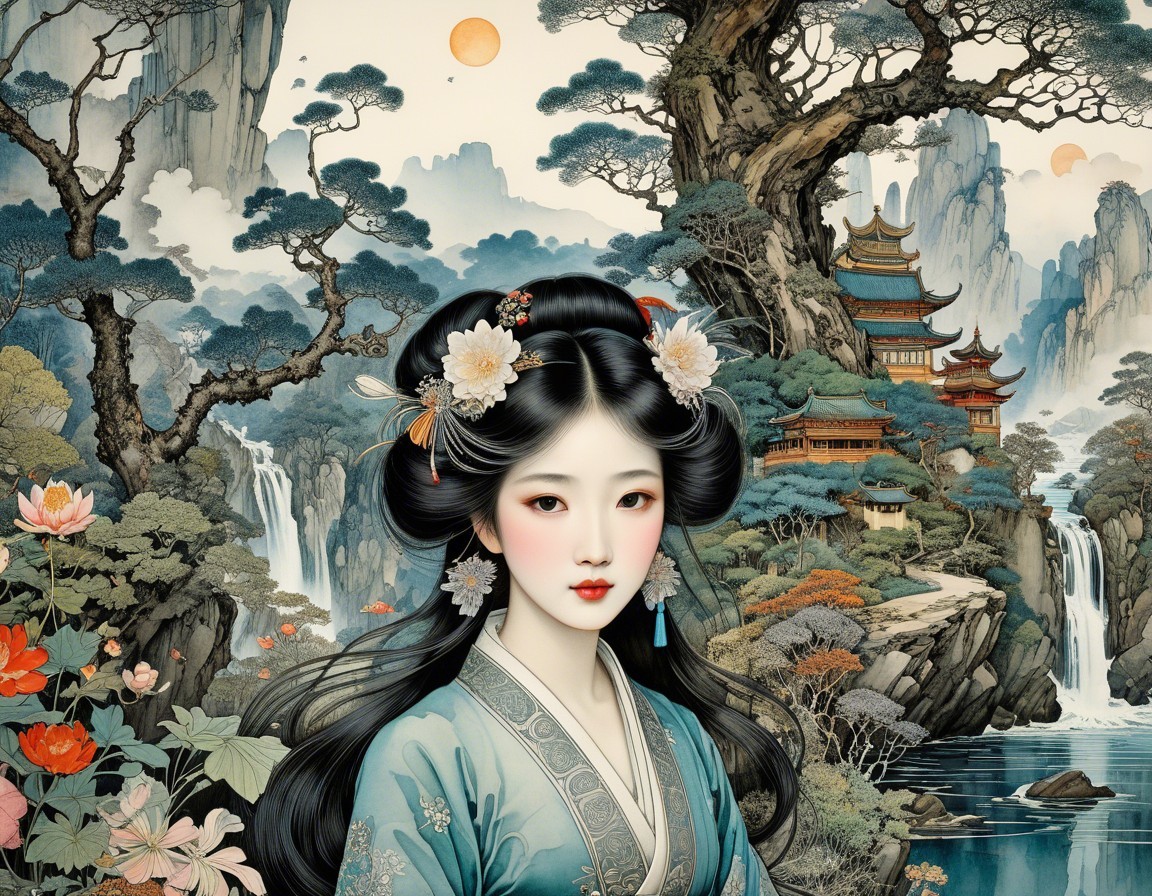 A serene landscape featuring traditional Asian architecture and a graceful bridge over a calm river. Boats float gently, surrounded by lush trees and majestic rock formations under a pale moon.