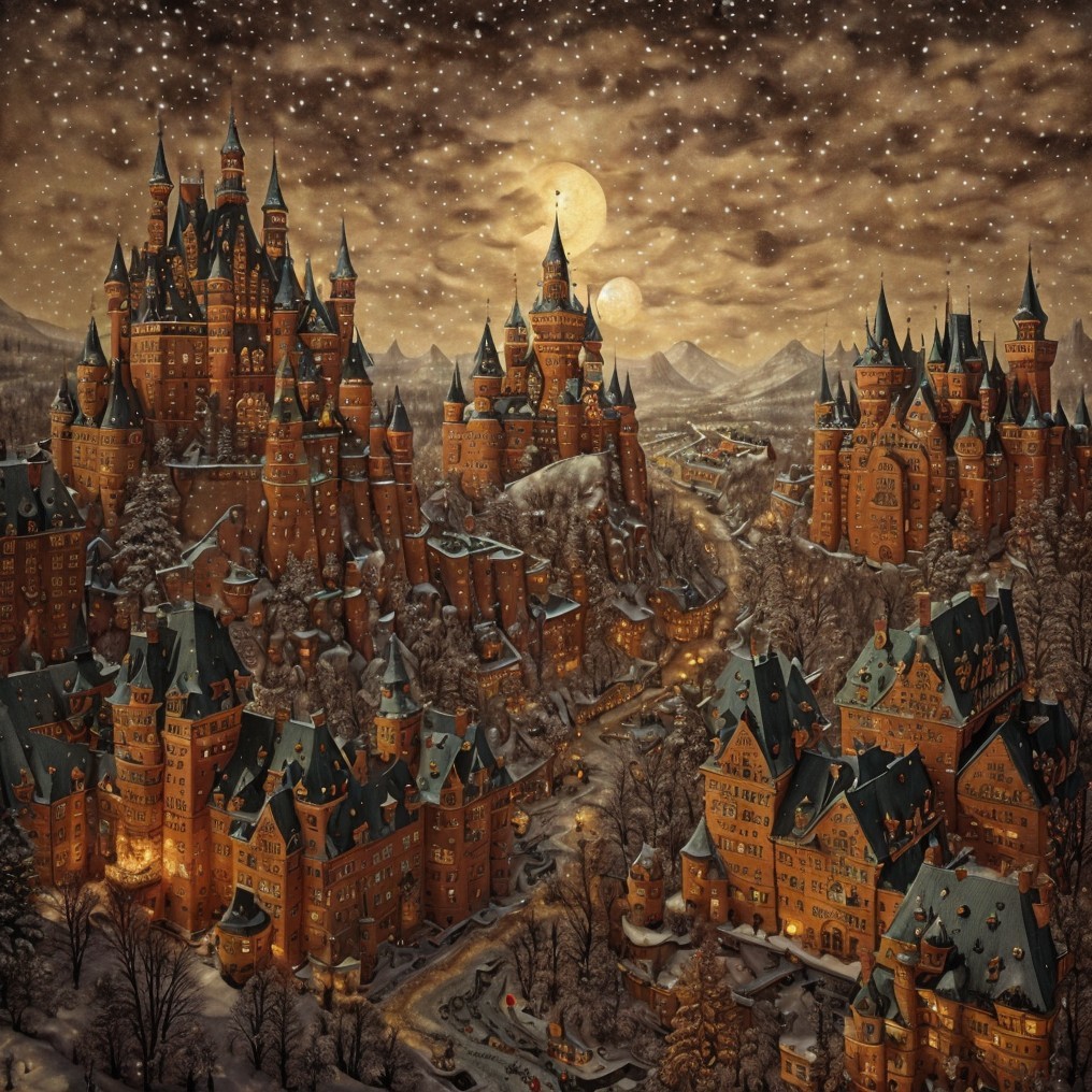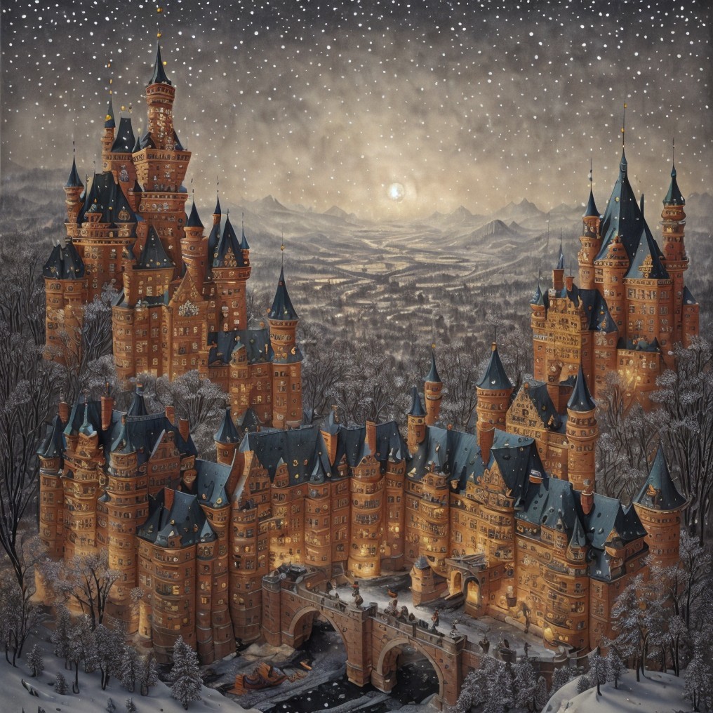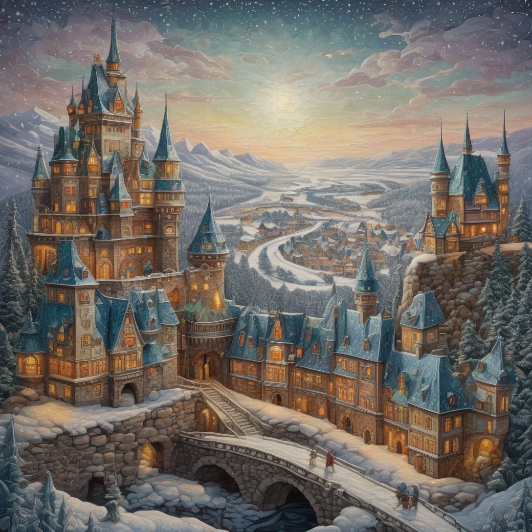 An enchanting snow-covered castle at twilight with illuminated windows, a stone bridge, and a wintry landscape.
