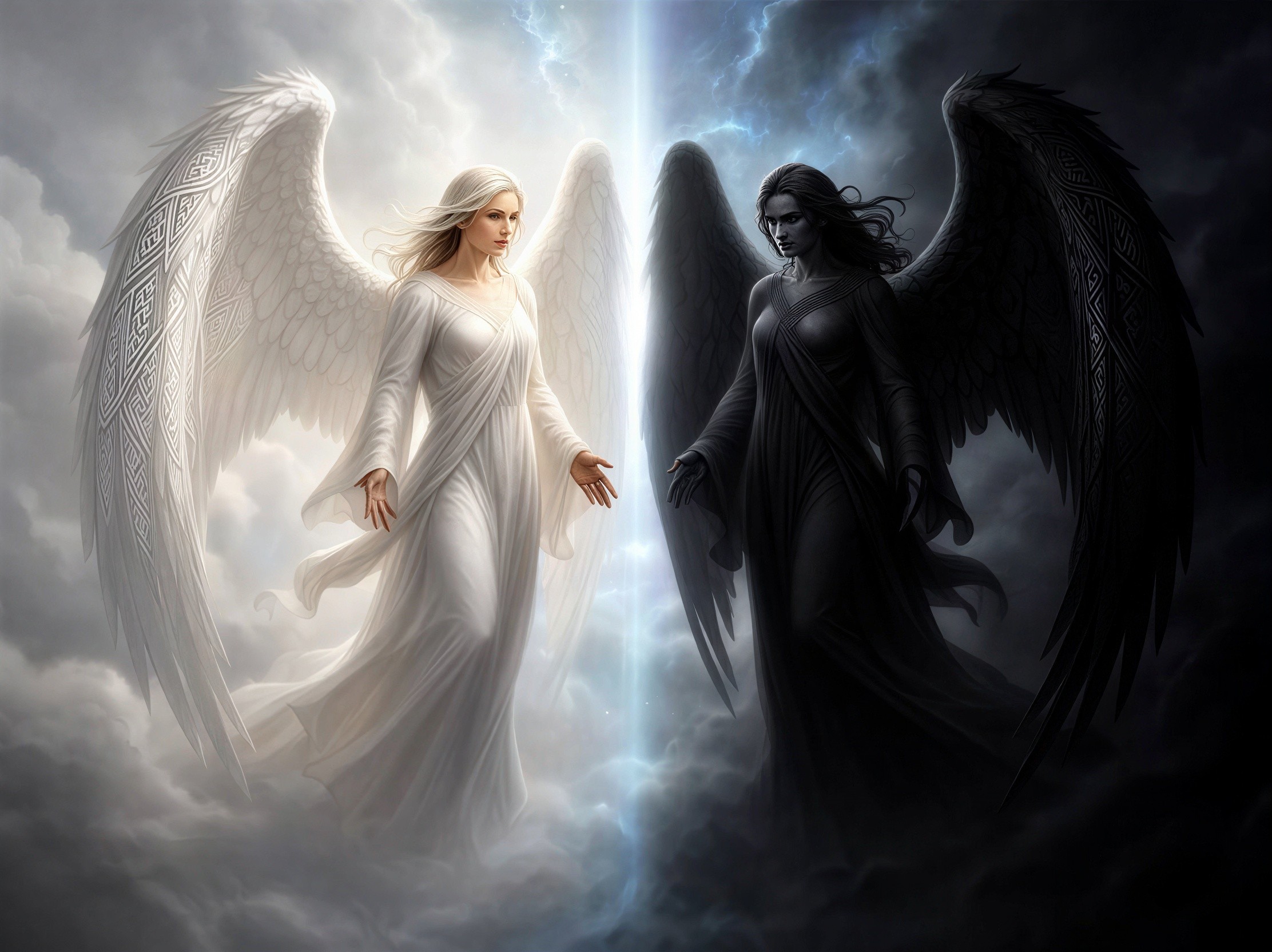 Two angelic figures, one radiating light and purity on the left, the other shrouded in darkness and mystery on the right, stand facing each other from opposite sides of a vertical beam of ethereal light splitting the image. The left angel, with long flowing blonde hair, fair skin, and large white feathered wings