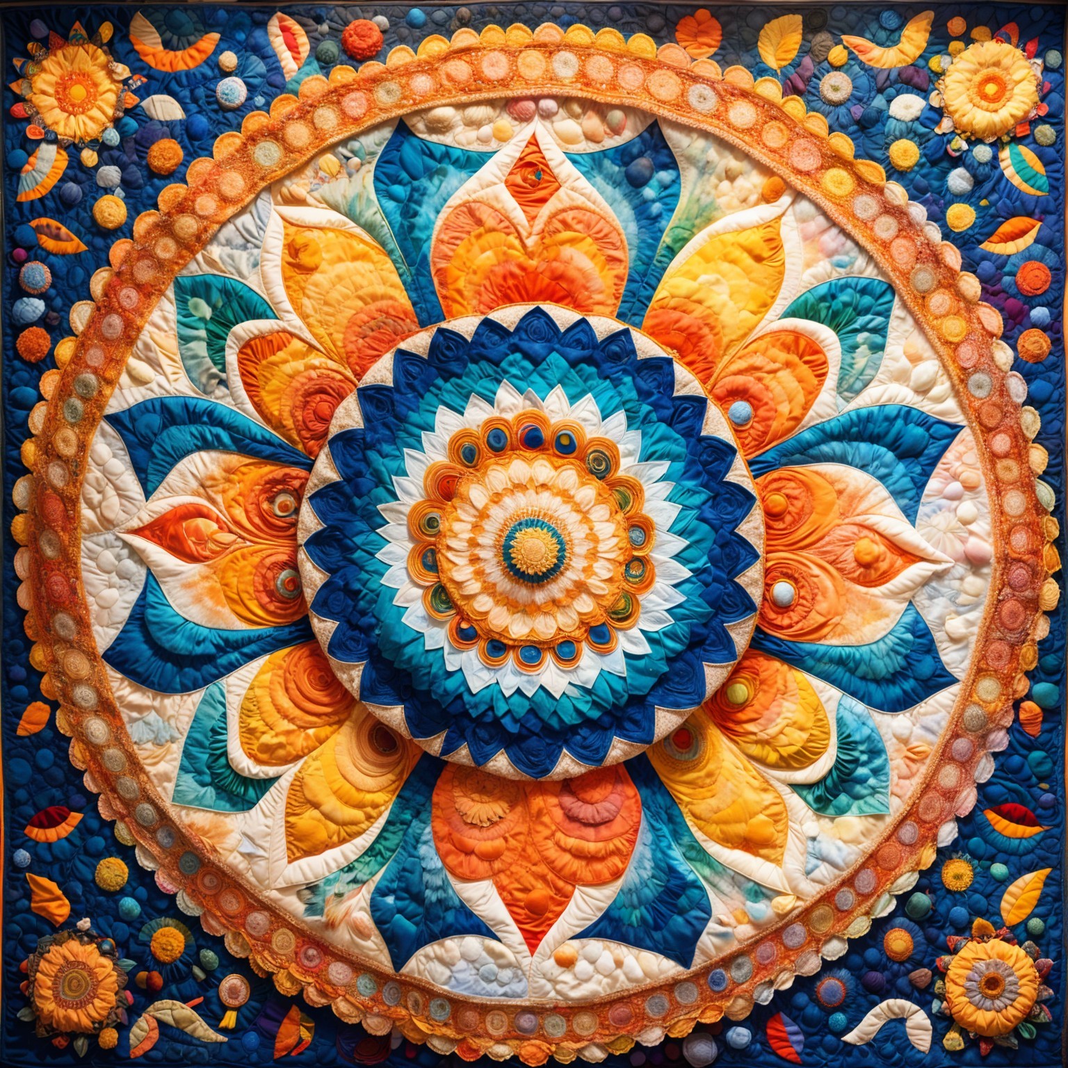 A vibrant quilt featuring a central circular design of stylized leaves in shades of blue, orange, and gold, surrounded by intricate geometric patterns, creating a warm, dynamic artistic effect.