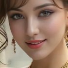 A close-up portrait of a young woman with captivating brown eyes, soft makeup, and flowing hair. Her smooth skin and subtle smile exude elegance and warmth, creating a striking visual impact.