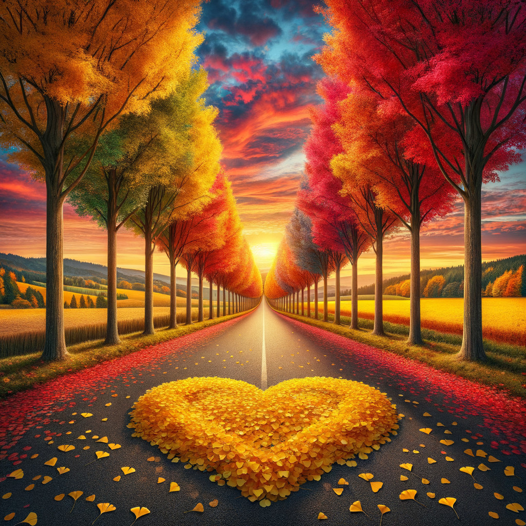 On the ground, a heart shape formed from scattered yellow ginkgo leaves creates a focal point, adding a romantic touch to the idyllic setting. The background reveals rolling hills, adorned with golden fields, complementing the warm tones of the sunset. The ambiance is serene and inviting, encapsulated by the natural beauty of autumn foliage. The overall composition evokes a sense of tranquility and love, perfect for an autumn-themed artwork."