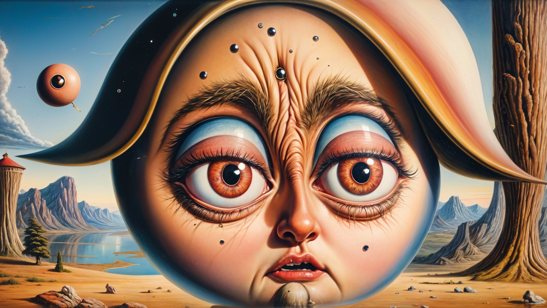 A surreal scene depicts a close-up of a wide-eyed astronaut staring out of a space helmet, with vibrant planets and a cosmic landscape in the background, blending curiosity and wonder.
