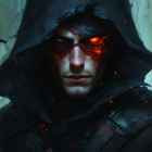 The image features a mysterious figure cloaked in dark attire, with glowing orange eyes and a shadowy background, evoking an ominous and intense atmosphere.