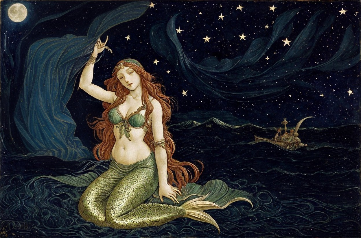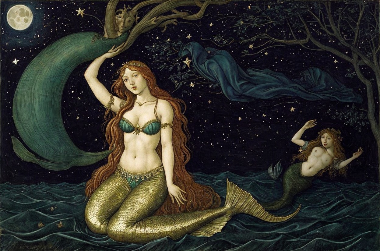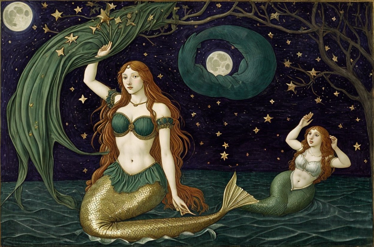 An artwork featuring two mermaids with golden tails under a starry night sky with a prominent moon.
