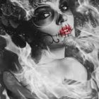 The image features a striking woman with elaborate skull makeup, including red and black designs. She wears a dark lace top and a floral headpiece, surrounded by swirling smoke, creating a mysterious atmosphere.