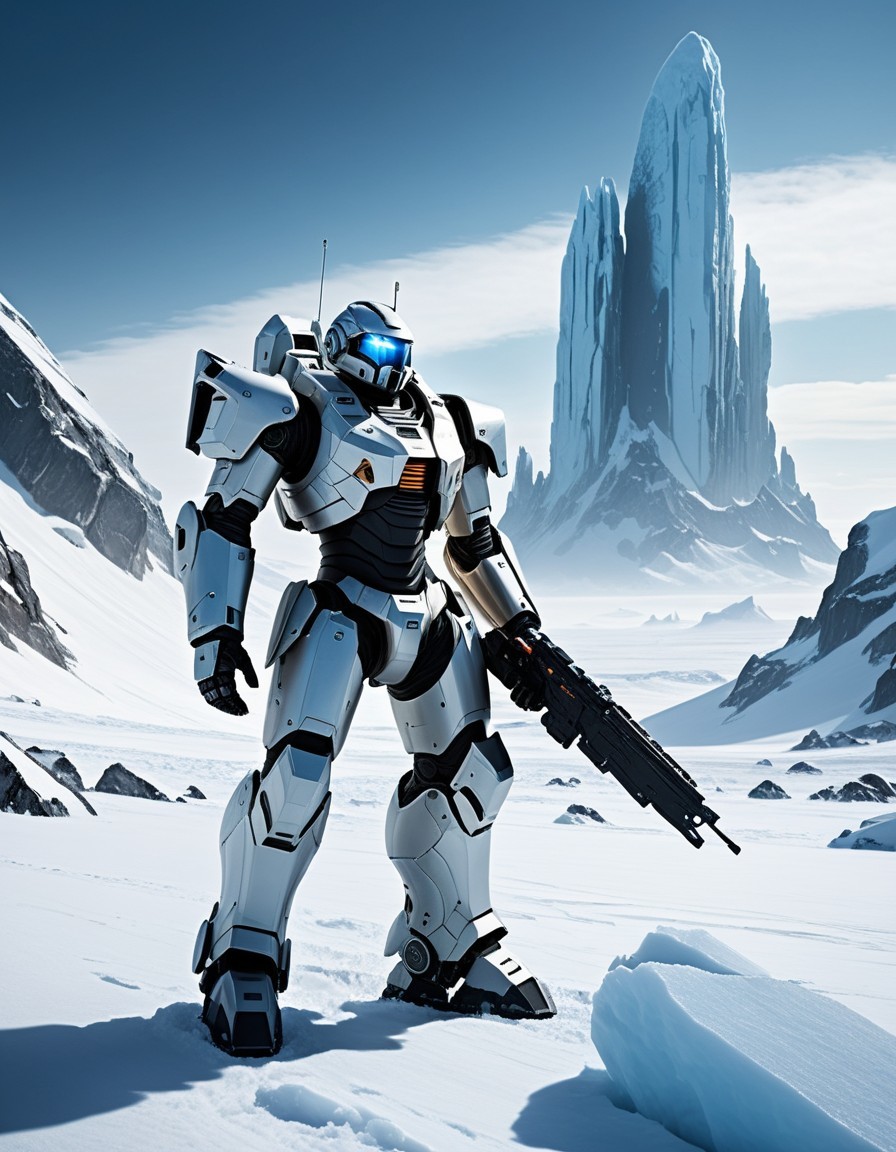 A futuristic robot stands in a snowy landscape, featuring sharp ice formations in the background. The robot is equipped with blue visor and a sleek design, holding a futuristic weapon.