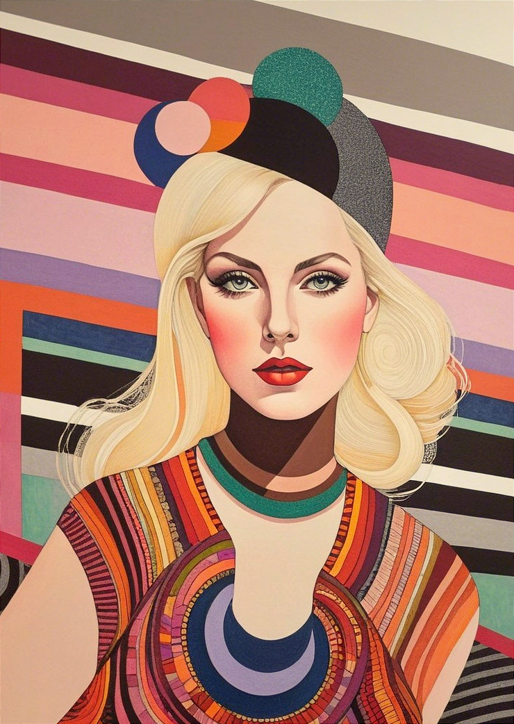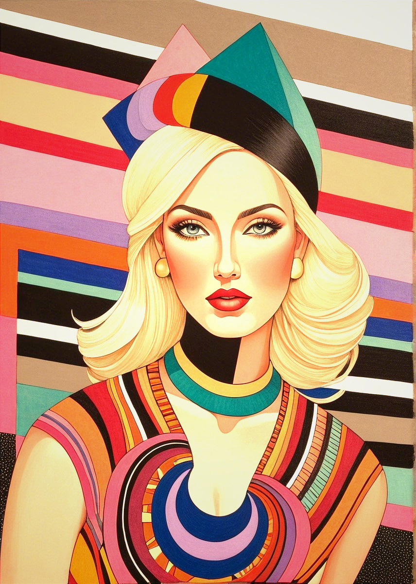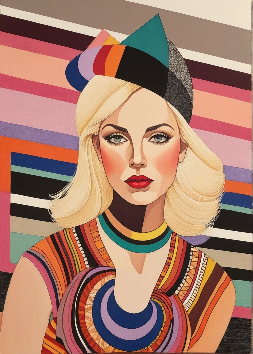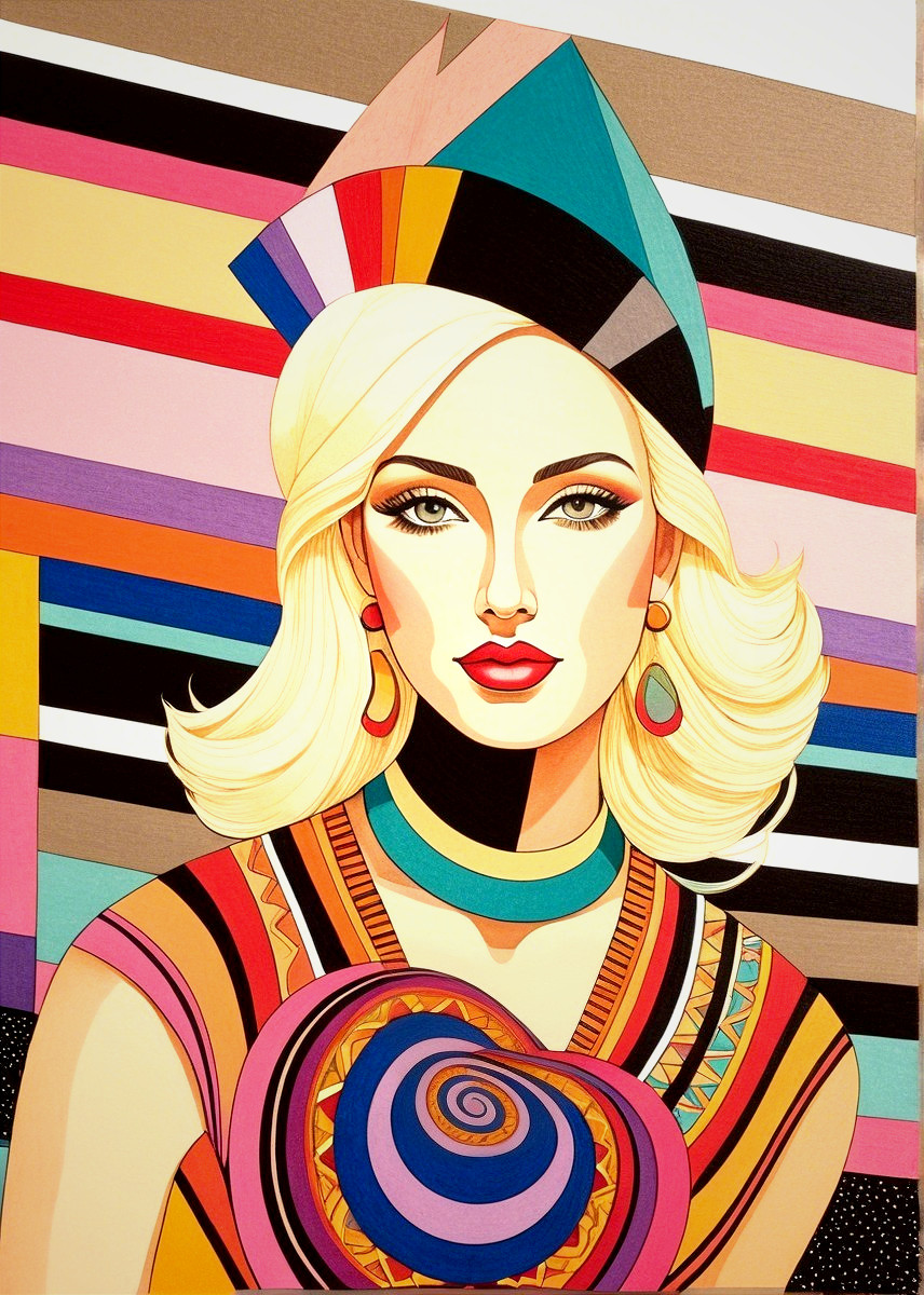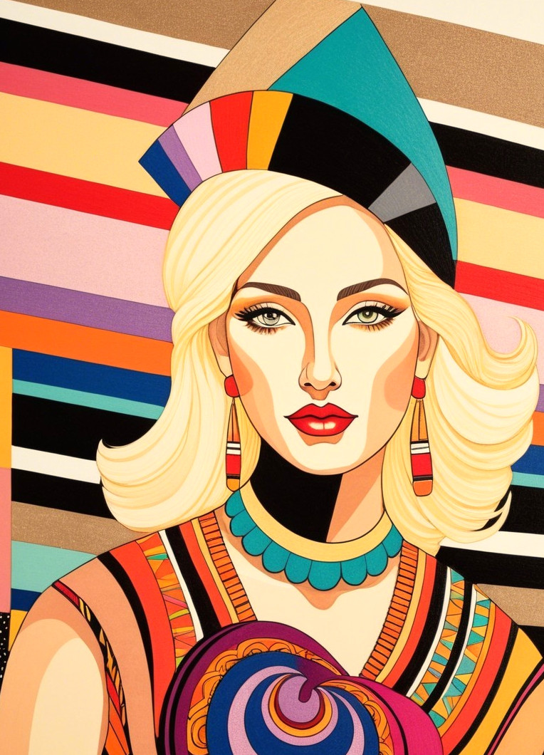 The image features a colorful, stylized portrait of a woman with bold makeup and blonde hair. She wears traditional-inspired attire and accessories, set against vibrant, striped backgrounds.