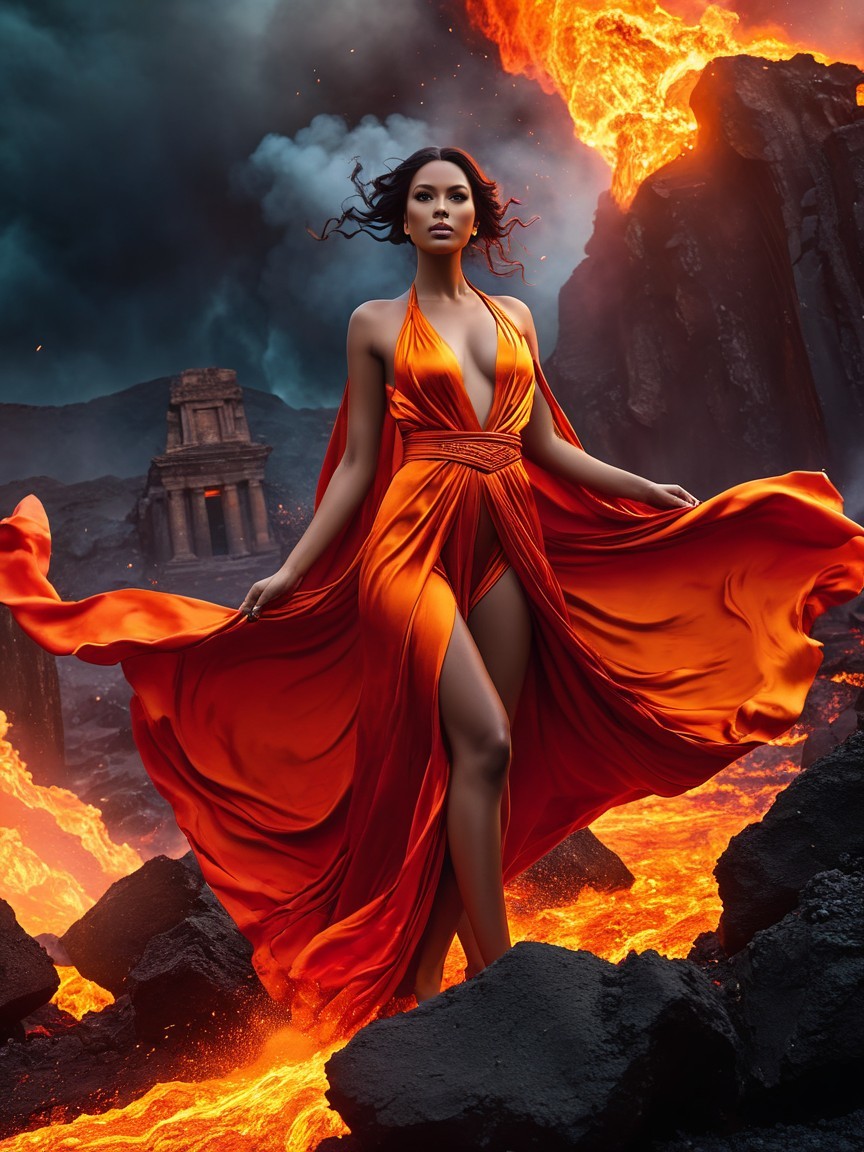 A beautiful woman with dark features and wavy hair, wearing a flowing, cleavage-baring orange dress with a cape, stands in a volcanic landscape where lava flows and dark rocks surround her. In the background, an ancient ruin can be seen through dark clouds and fiery explosions from a volcano light up the
