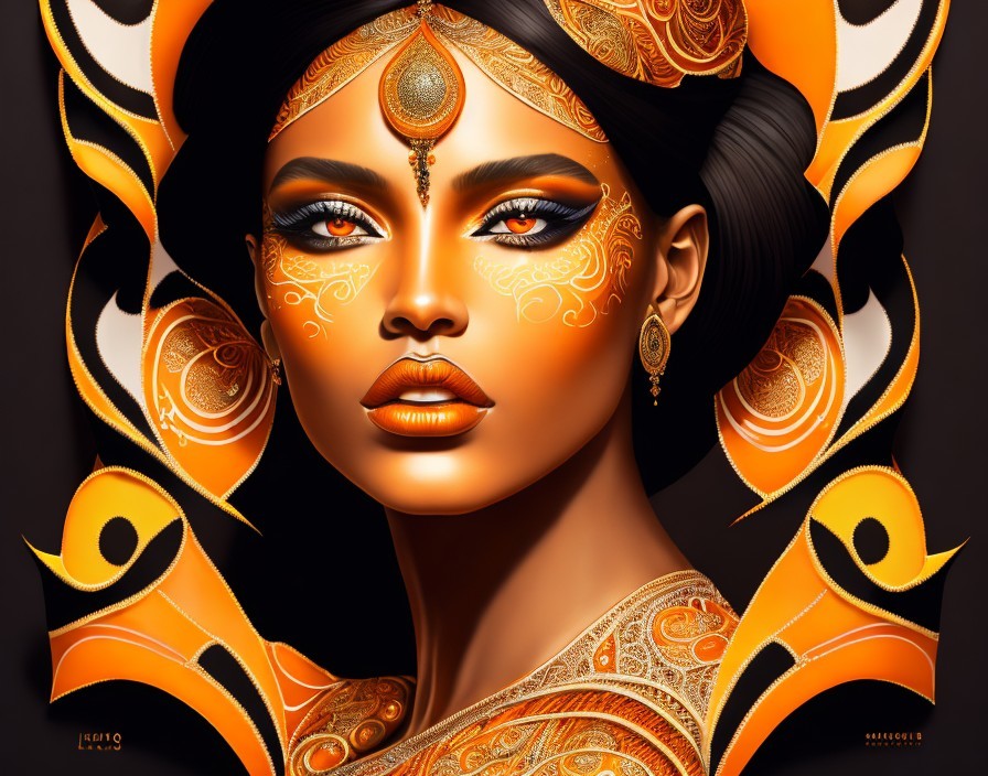 A digital artwork of a woman with intricate orange and gold face paint and ornate headgear in a similar color scheme, exuding a regal aura.