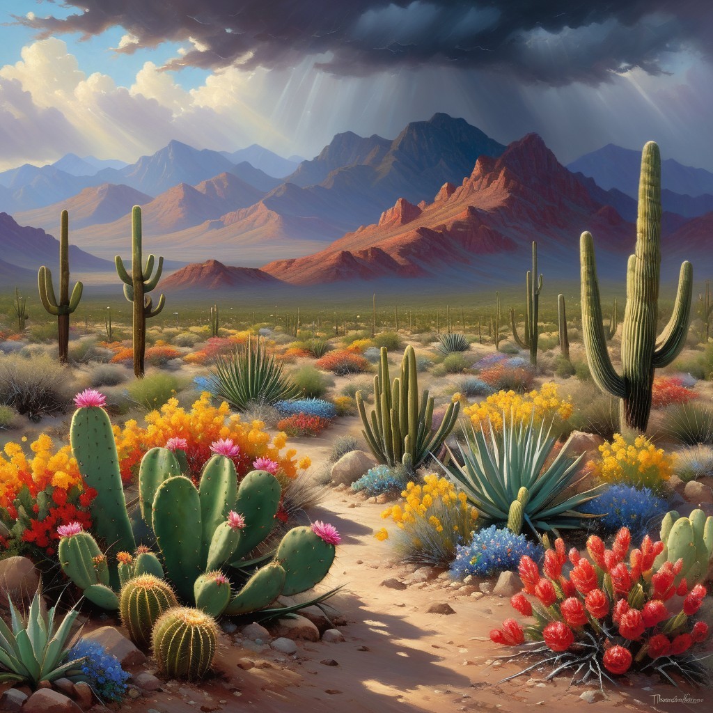 A Southwest desert landscape in USA with colourful cacti and blooming flowers, framed by mountains under a dramatic, cloudy sky with rain. Nature’s beauty and contrast abound.